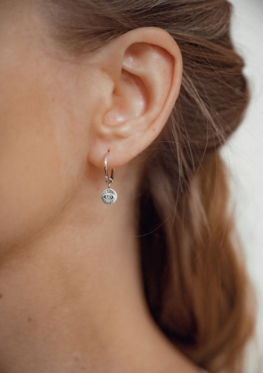 Evil Eye Charm Hoop Earrings Sterling Silver