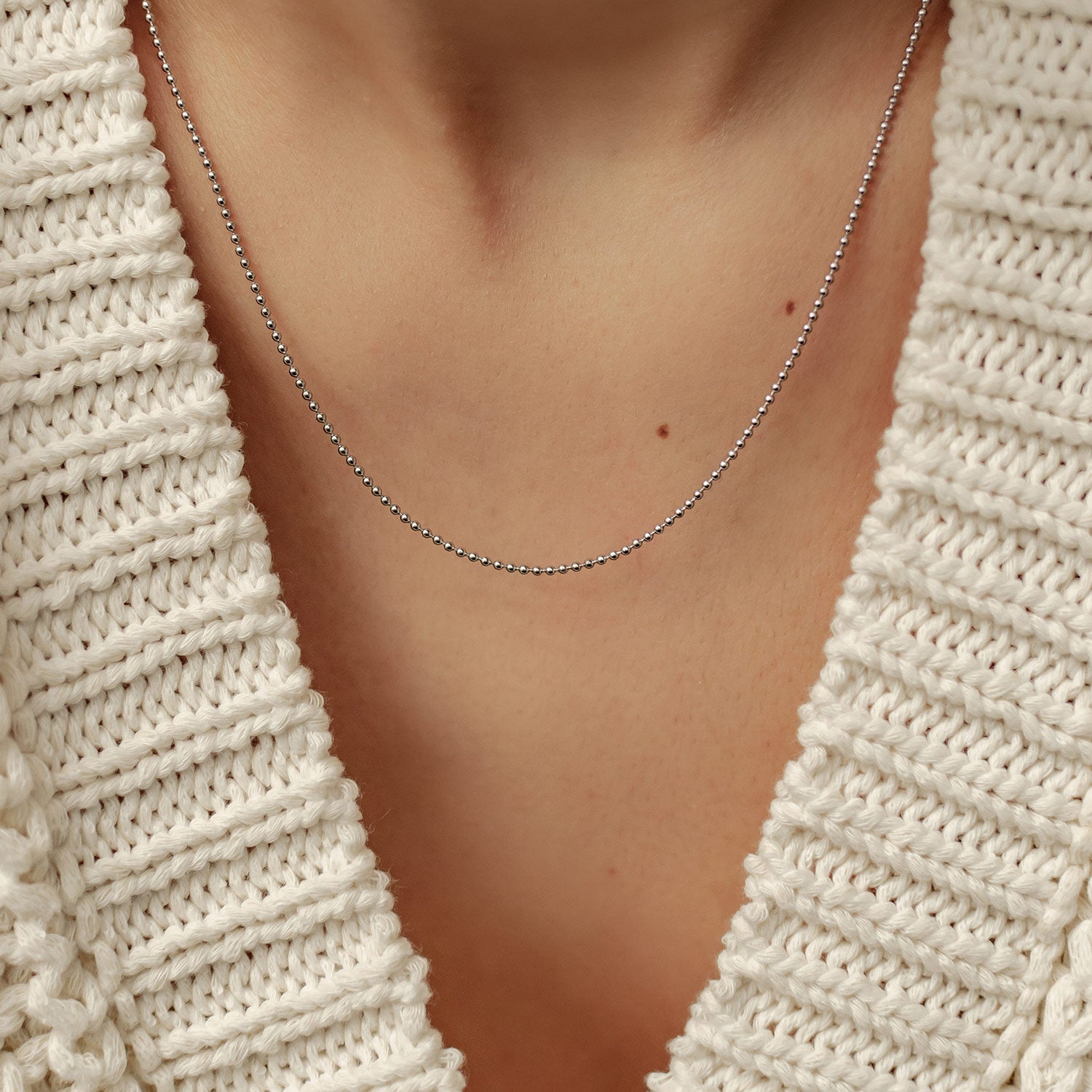 A stainless steel bead chain necklace made from small, solid metal spheres all connected together, which fastens with an ‘lobster claw’ clasp and extension chain with hanging seashell charm. Lightweight and flexible, this necklace is especially suited for casual, streetwear looks. Also check out Mixed Cable and Bead Chain Necklace Silver.