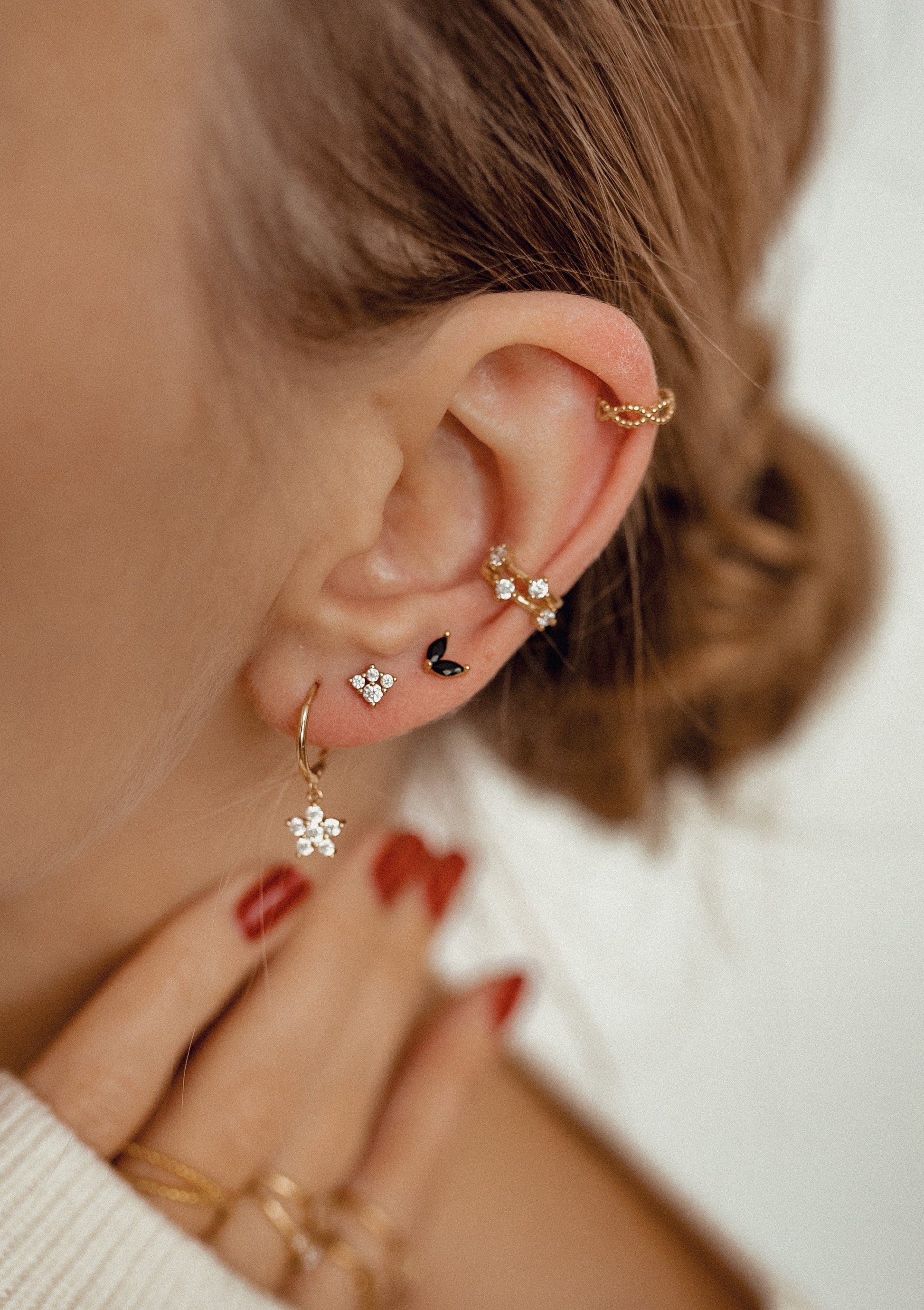 These stud earrings are made from 18 karat gold-plated sterling silver and feature two black, Marquise-cut cubic zirconia arranged in a wing-like formation. They fasten at the back of the ear with butterfly clasps. Feminine and unique, these studs are suitable to wear day or night — just be prepared to dazzle! Also check out Gemstone Firefly Stud Earrings Sterling Silver Gold.