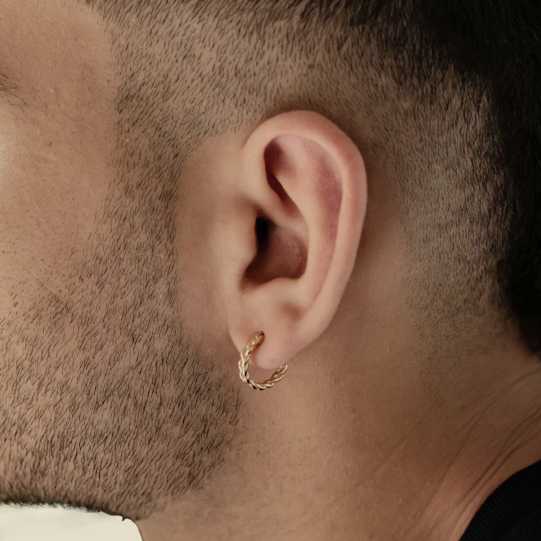 Made from 18 karat gold-plated sterling silver, these are small, hinged hoop earrings which feature a braided rope design all the way around. They fasten with a thin metal earpiece which snaps into a U-shaped closure at the back. Timeless and easy to wear, these hoops will compliment a huge variety of outfits, from streetwear to more elegant, formal wear. Also check out Twisted Hoop Earrings Sterling Silver Gold.