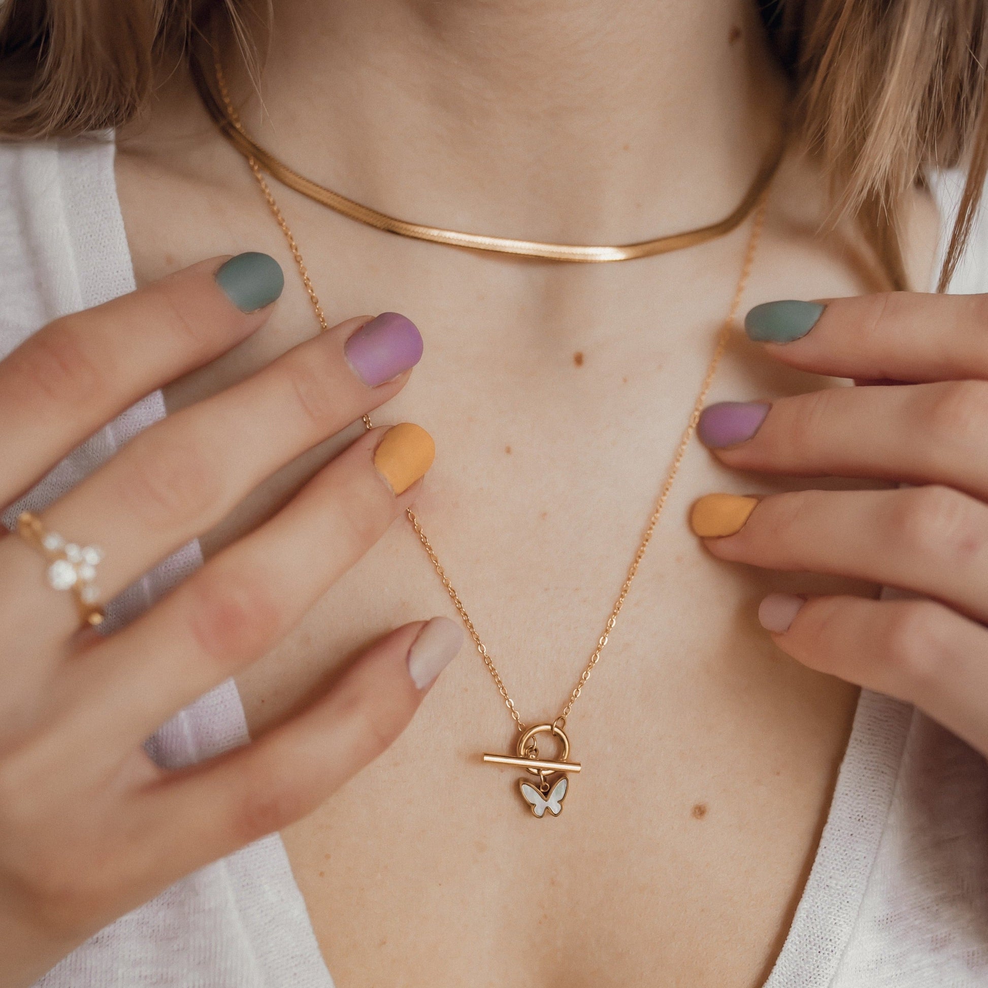 This necklace is made from 18 karat gold-plated stainless steel and features a thin chain, a decorative T-bar closure, and a small butterfly-shaped charm with iridescent shell insert attached to the closure by a single round link. A modern and feminine piece that will pair well with anything from ribbed tanks to floaty blouses. Also check out Butterfly Pendant Necklace Sterling Silver Gold.