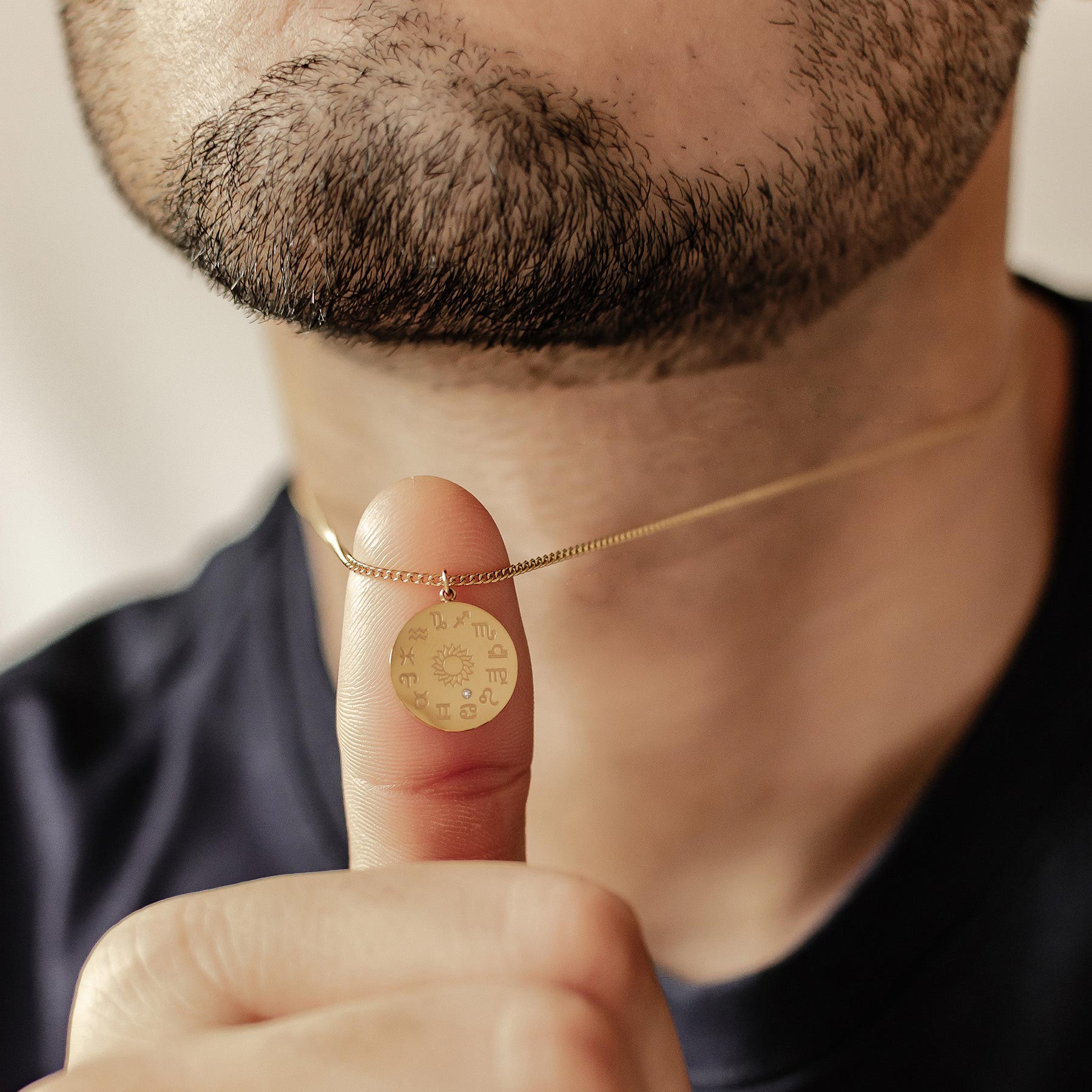 This is a double-sided pendant featuring a small crescent moon, star, and five tiny zirconia stones connected by a finely engraved line, while on the other side, it has all 12 zodiac signs surrounding a sun with Cancer highlighted by a zirconia stone. Nurturing, loyal, tender and sentimental Cancer will be attracted to the imaginative and creative design of this stunning piece.