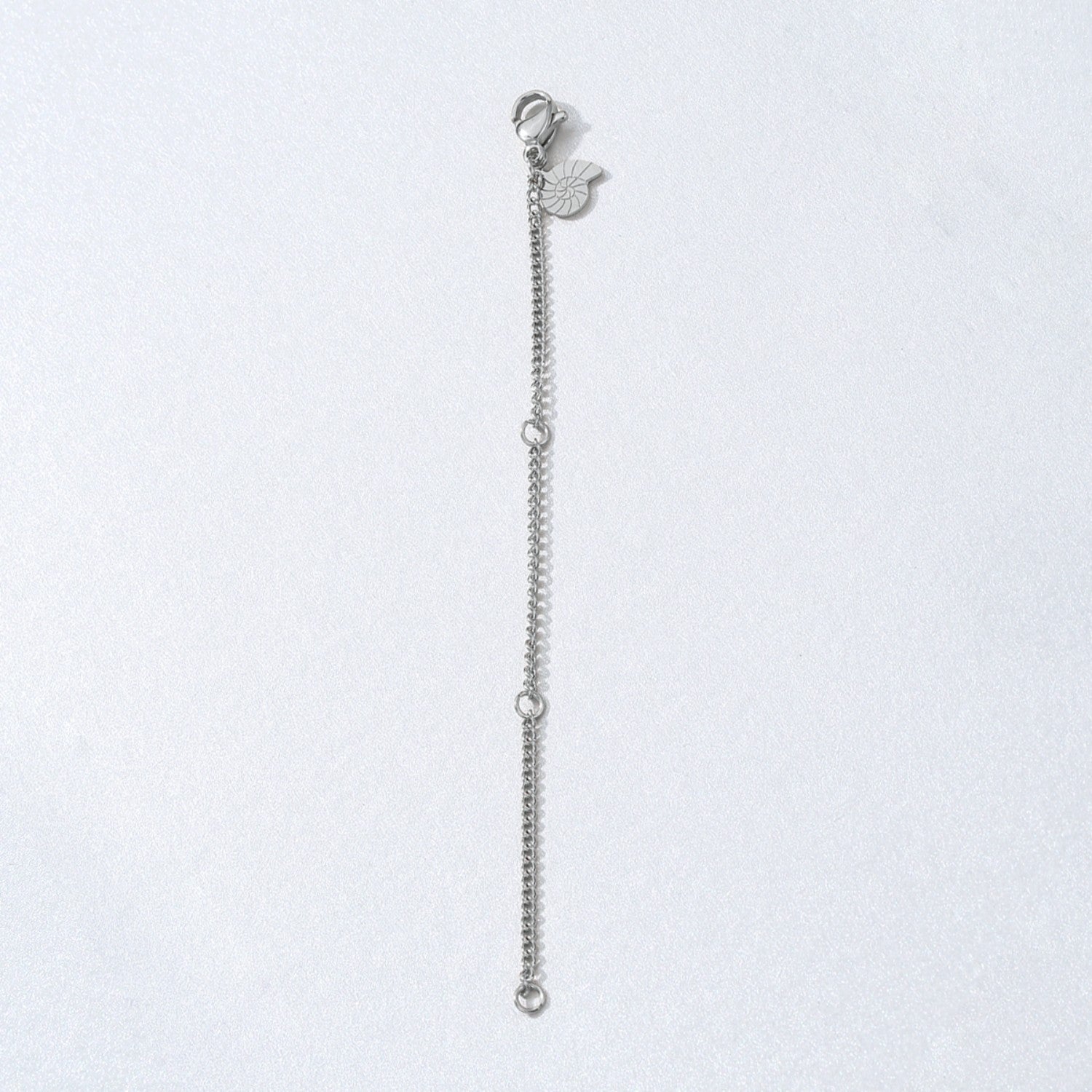 This is our special necklace extension chain made from stainless steel, which has an oval-shaped lobster claw clasp at one end, along with our signature seashell charm, and three circular links at various points on the chain. Using the lobster clasp, you simply connect this to any existing necklace and use one of the larger links (which are placed at 3.5 cm, 7 cm, and 10.5 cm away from the clasp) to extend the length of your necklace for maximum versatility. Now you can wear your jewelry your way.