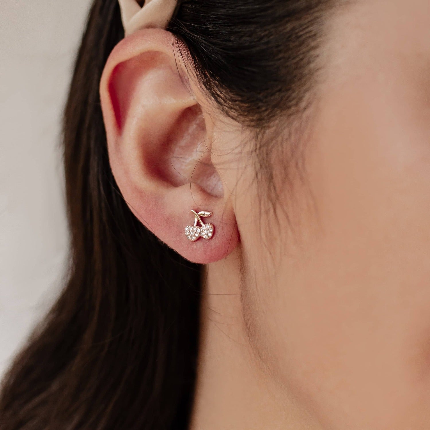 This single stud earring features a pair of cherries covered in 16 tiny zirconia stones and a short stem with one leaf attached to it. It fastens to the ear with a butterfly clasp and is available in three colors: 925 sterling silver, 18 karat gold-plated sterling silver, or rose gold-plated sterling silver. The perfect way to add some retro fun to your outfit.