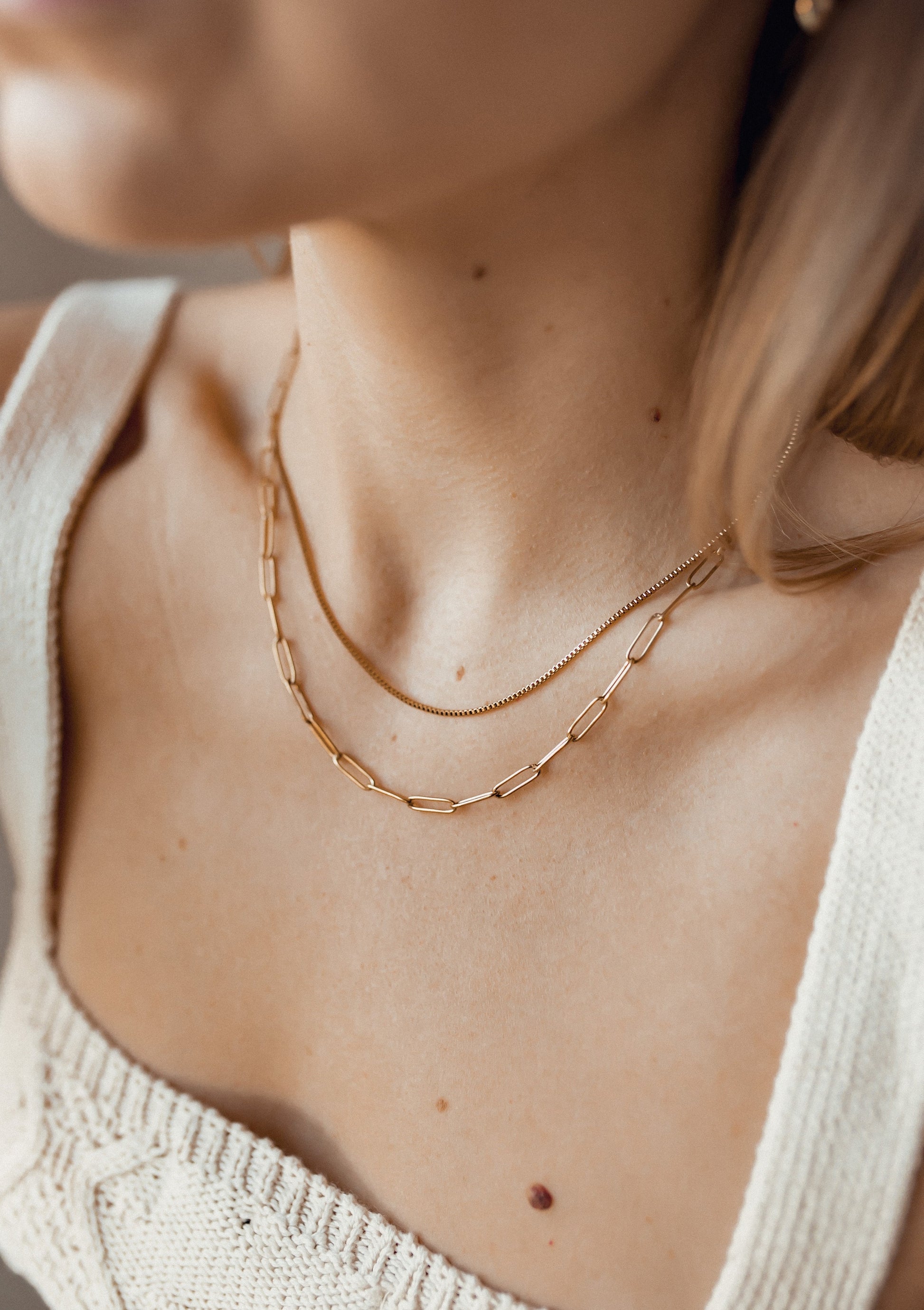 This is a double chain necklace made entirely from stainless steel, plated in 18 karat gold, which has a shorter, ‘box chain’ style chain sitting on the inside of a longer chain, made from larger, oval-shaped links. Both chains fasten together at the center back, where a ‘lobster claw’ clasp closes the entire piece, and an extra length of chain, made from smaller links and with a small shell pendant hanging at the end, allows for a custom fit. This is a subtle and classic piece of jewelry that will pair well with anything from formal wear to casual tees. Also check out Chunky Chain Y Necklace Rose Gold.