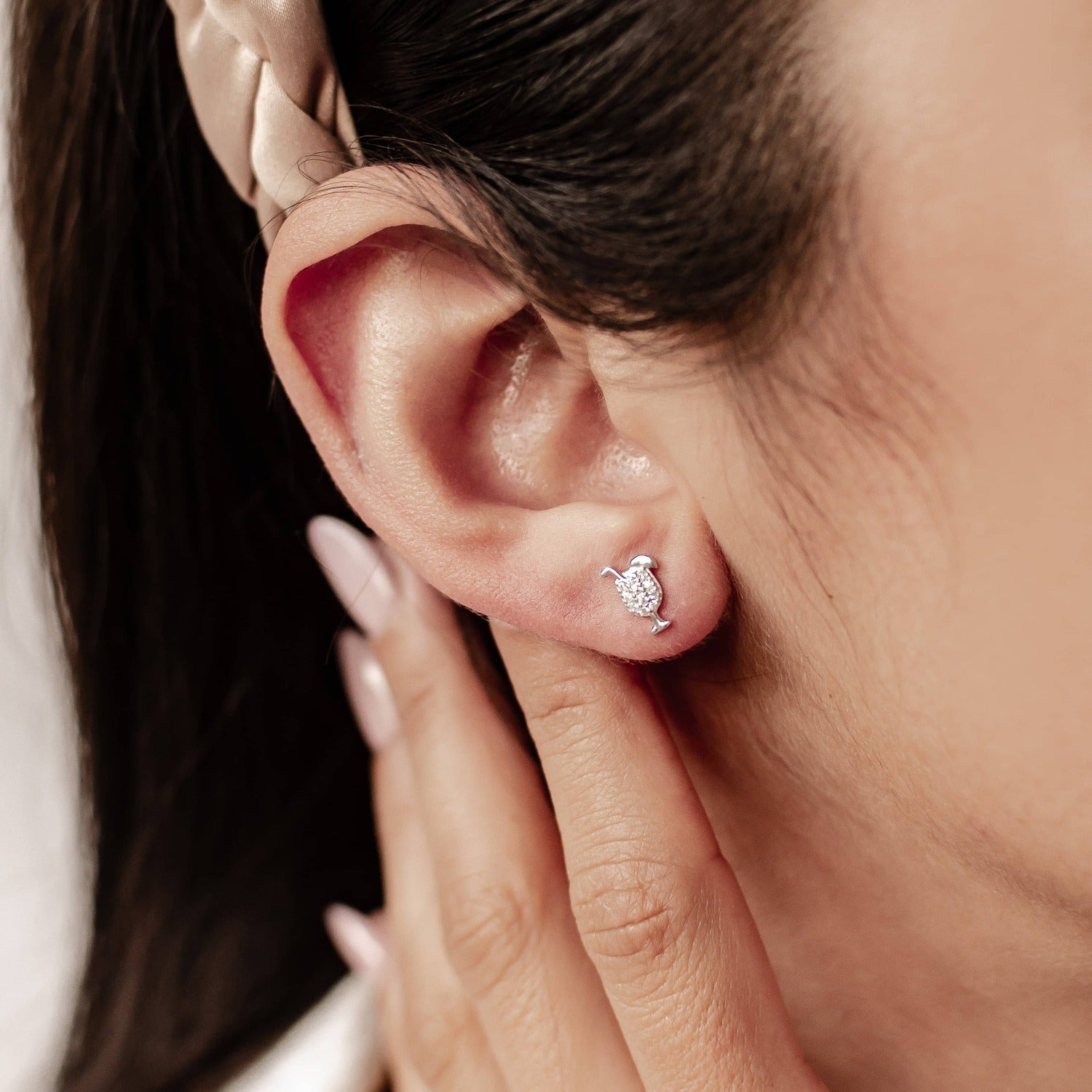 This small stud earring features a cocktail glass garnished with a straw and lemon wedge, and has 11 zirconia stones covering the surface of the glass. It fastens to the ear with a classic butterfly clasp. This is a joyful, celebratory piece to add to your ear stack. Available in 925 sterling silver, 18 karat gold-plated sterling silver, and rose gold-plated sterling silver.