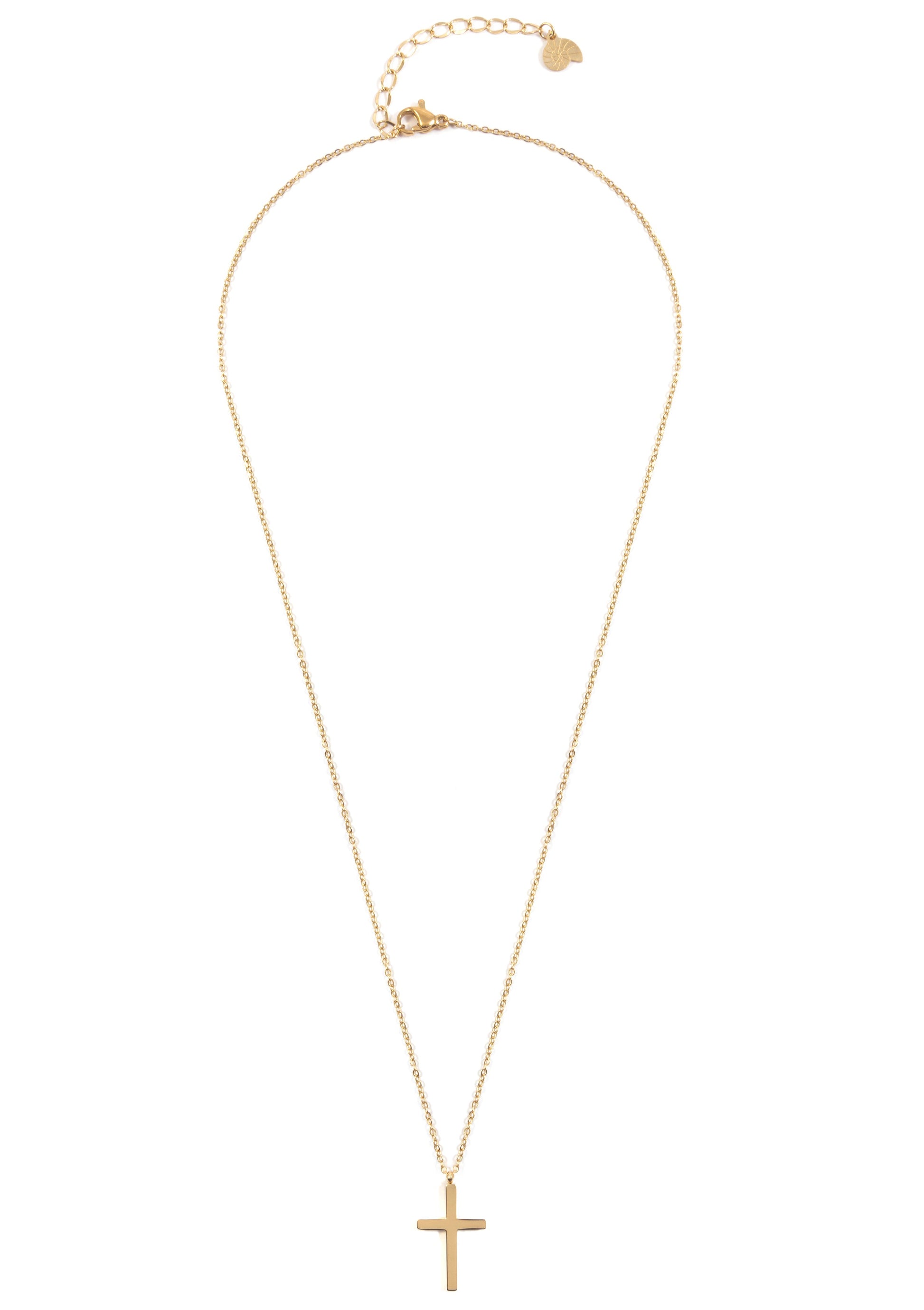 This necklace features a simple, golden cross pendant hanging off a thin golden chain and a lobster claw clasp which fastens it at the center back. It also has an additional short length of chain and a hanging golden seashell pendant at the back so it can be adjusted. Streamlined, classic and versatile, this is a necklace that will stay in fashion for years to come and can be worn with practically any outfit. Alsocheck out Cross Pendant Necklace Rose Gold.