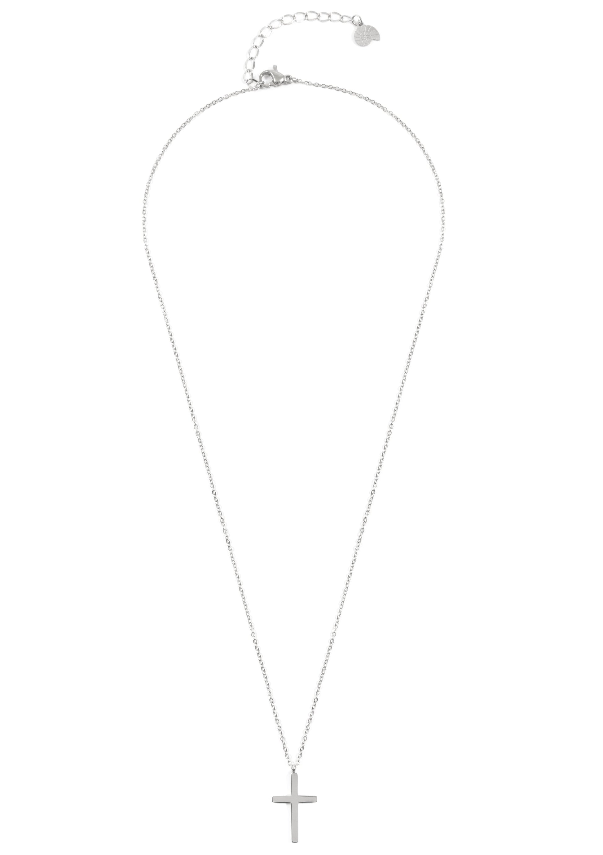 This necklace consists of a silver chain, a hanging silver cross pendant at the center front, a silver clasp at the center back, and a short additional length of chain with shell pendant at the back, allowing for an adjustable fit. It’s a piece that is both modern and timeless, is versatile enough to work with casual and formal outfits, and will look glam when layered with other necklaces. Also check out Cross Pendant Necklace Gold.