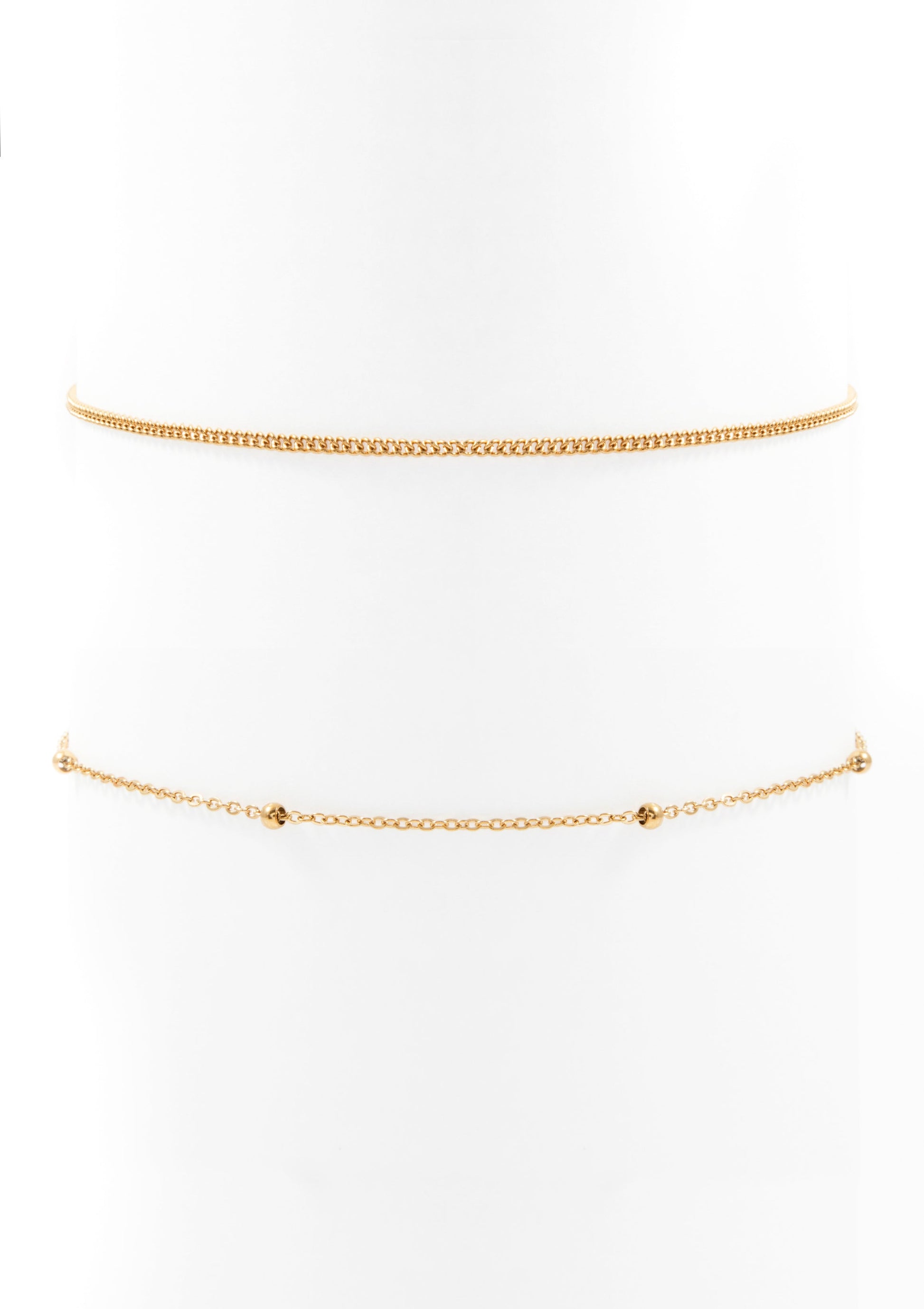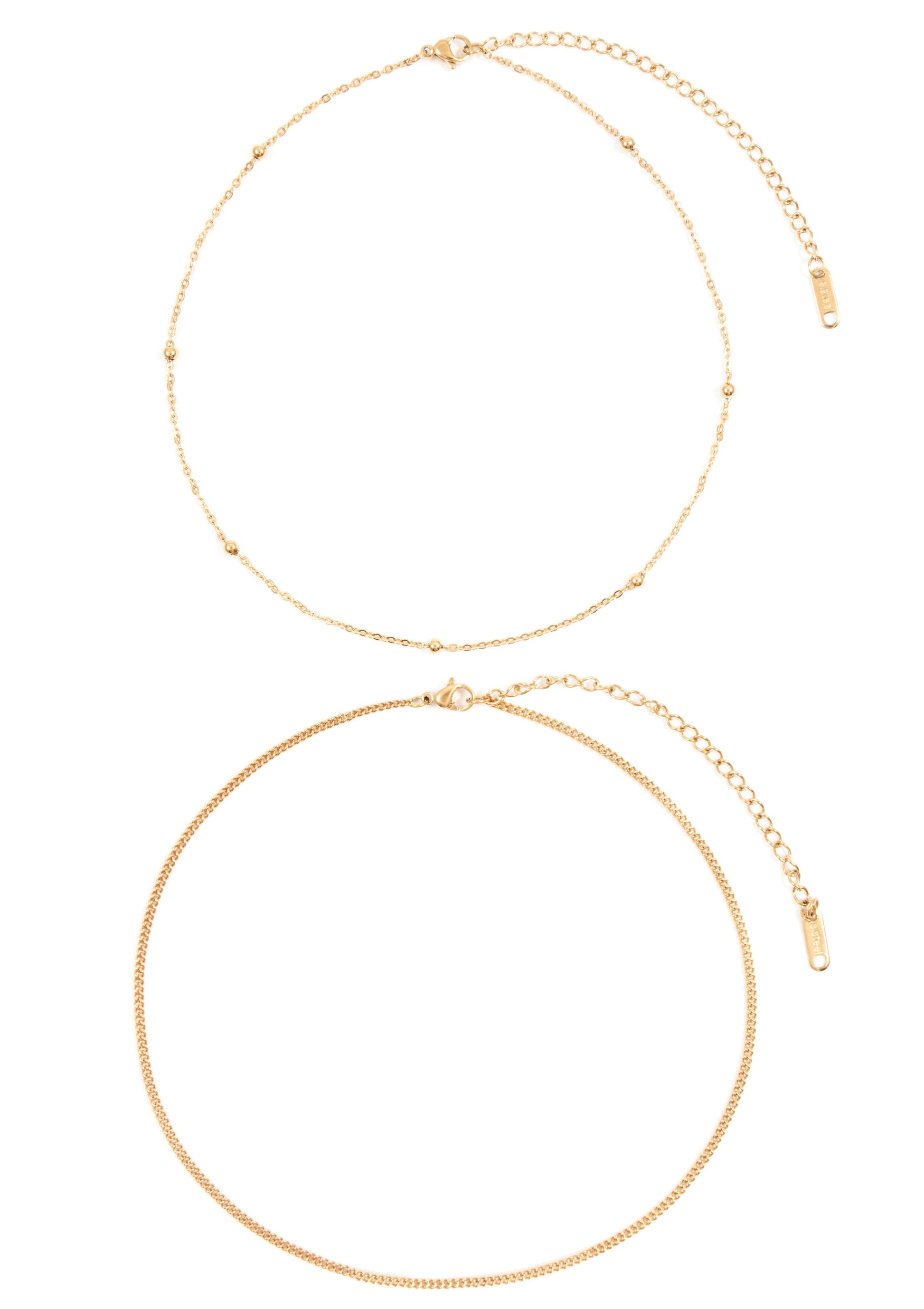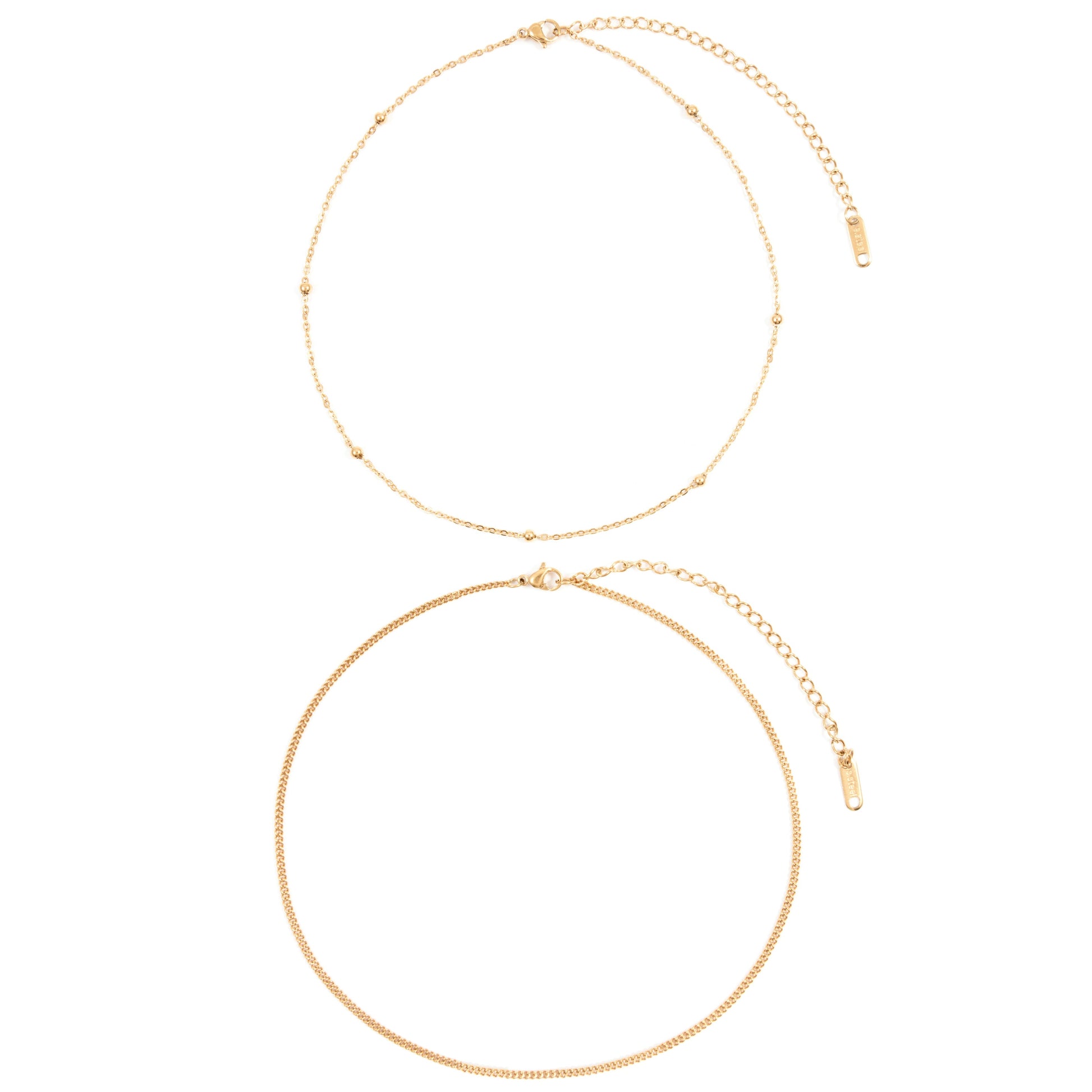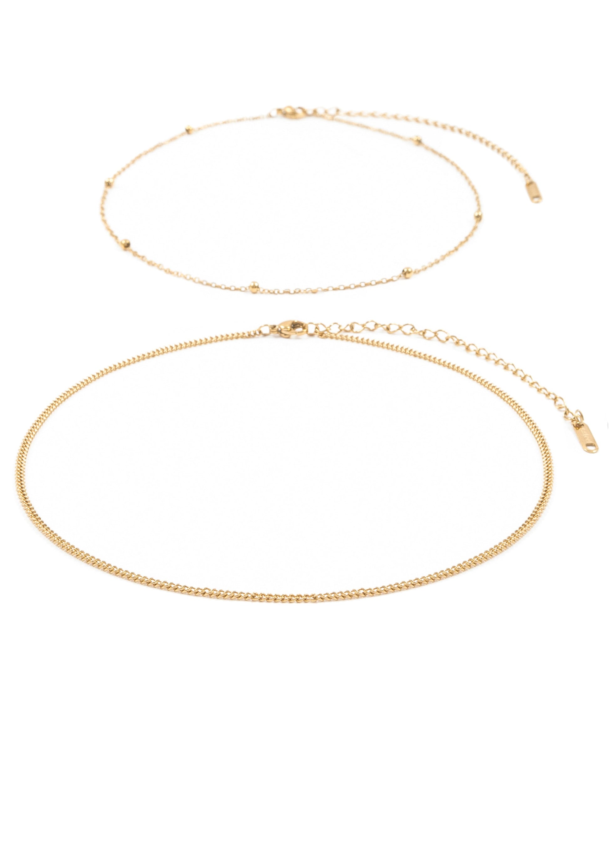 This set features two separate golden choker necklaces - one simple, flat-style chain necklace and one made from small chain links with seven delicate beads evenly placed around the necklace. Both close with a 'lobster clasp' at the back and have an adjustable length, allowing for a perfect fit. Great to wear with casual tees, distressed denim or dresses for a urban, yet glamorous look. Also check out Delicate Choker Set Rose Gold and Delicate Choker Set Silver.