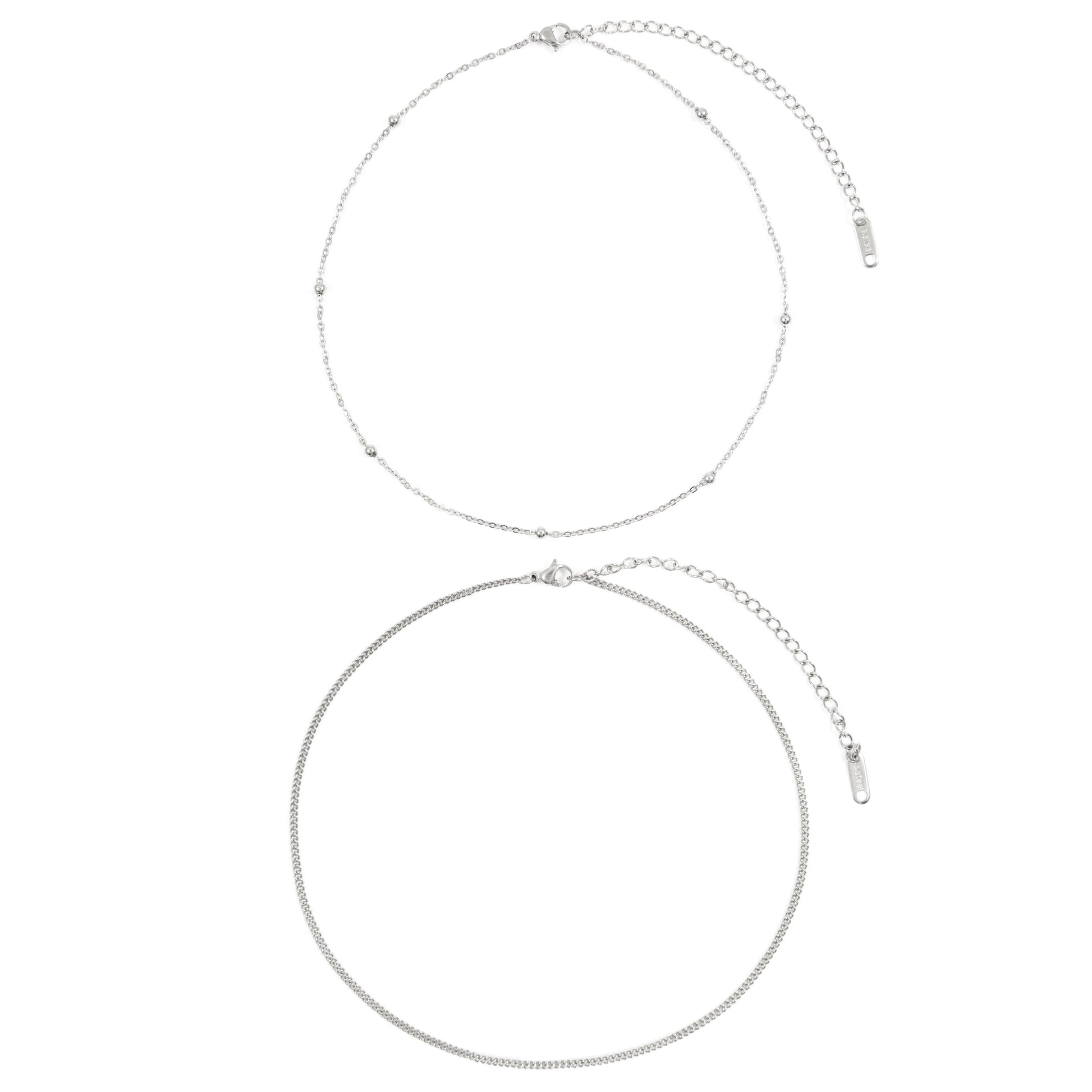 This is a jewelry set which consists of two different silver choker necklaces. It has: