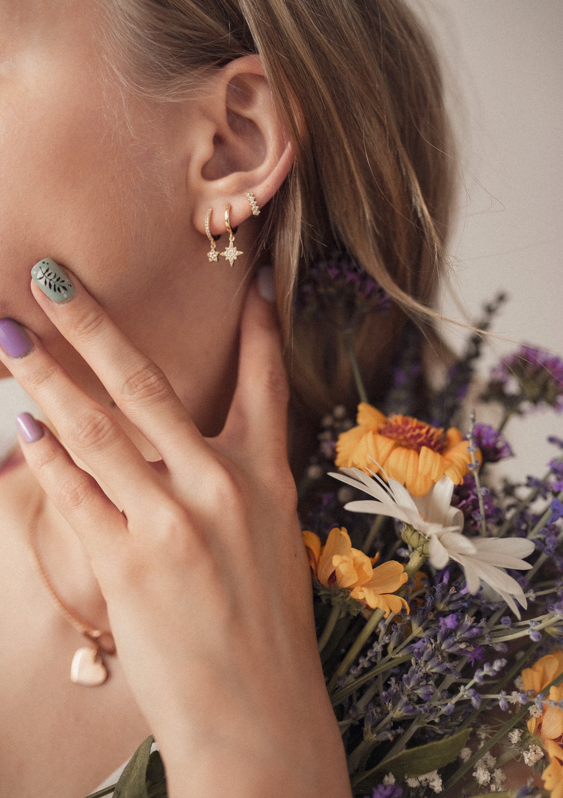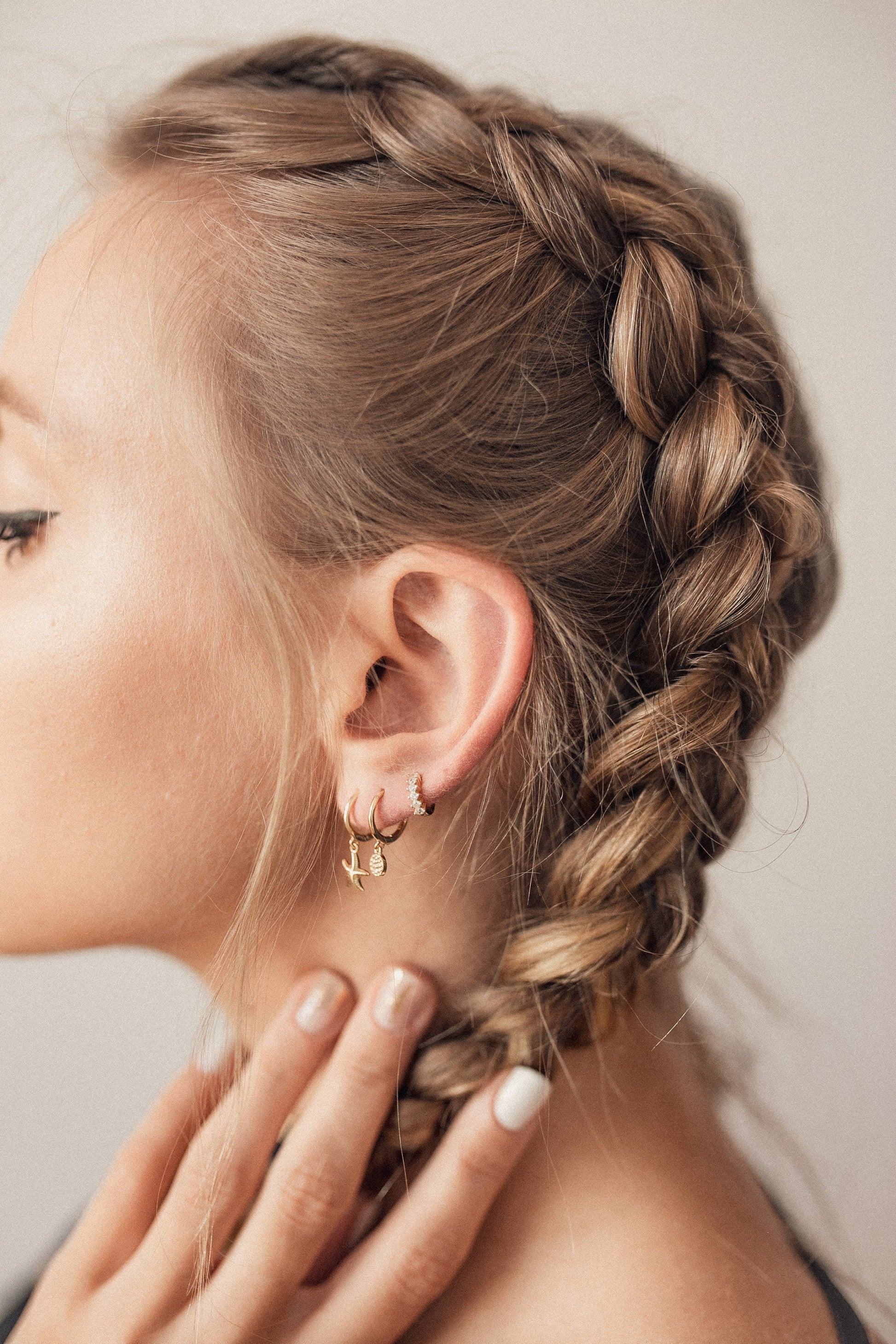 This is a pair of round ‘helix earrings’, made from 18 karat gold-plated sterling silver, which feature six tiny zircon stones inset into their outer edge, arranged in a gentle fan shape. They fasten together with a hinge clasp, are smaller than usual ear cuffs (the diameter of each measures less than 0.5cm), and are specifically designed to be worn on the inner ear bone. They feature a classic, elegant style, making them able to be worn with a wide variety of styles and outfits. Also check out Diamond Fan Helix Earrings Sterling Silver.