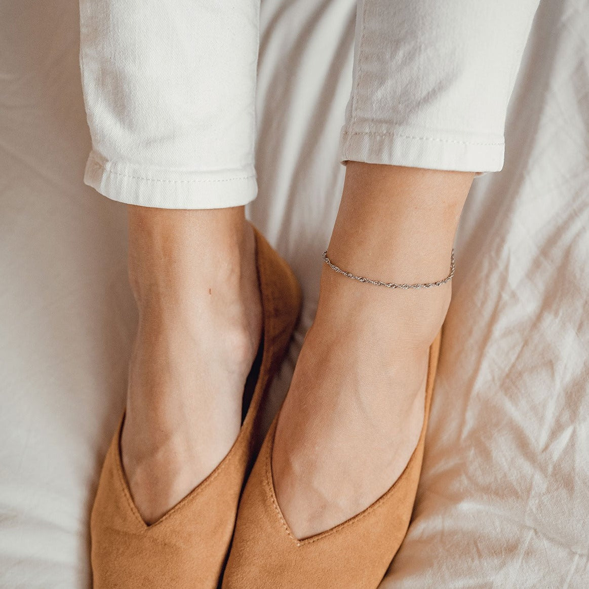 This is a silver Singapore-style chain anklet made from stainless steel, which consists of tiny, flattened, oval-shaped chain links, an oval-shaped spring clasp, and a short extension chain made from regular-sized chain links and with a small shell pendant attached to the end. A timeless and stylish piece that can be worn alone on the ankle, or layered together with other chains for a boho look. Also check out Fine Singapore Chain Necklace Silver.