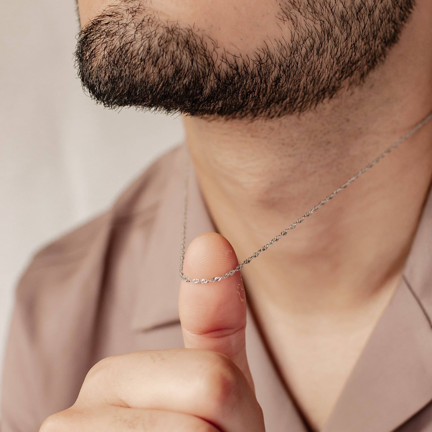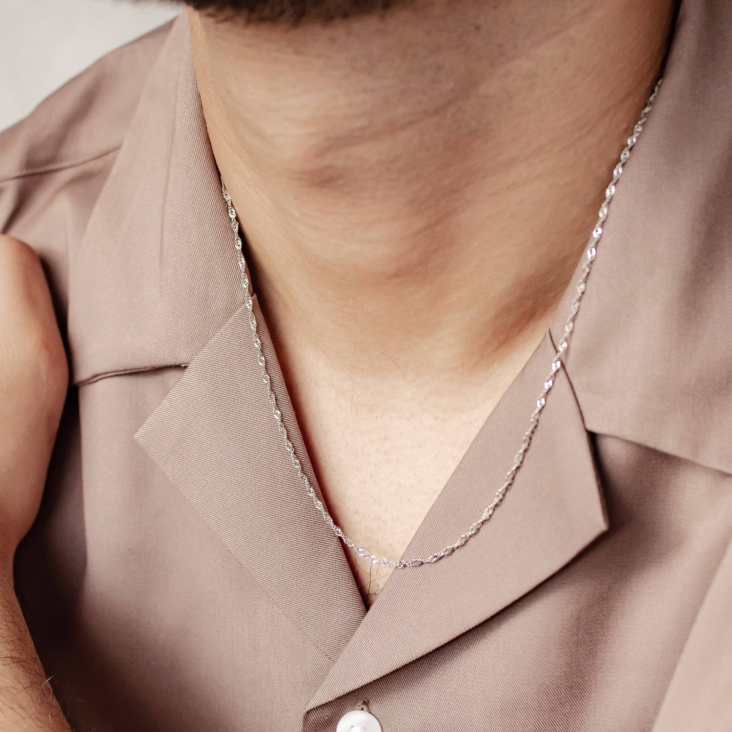 This is a thin, 925 sterling silver chain, made in Singapore style, which features a series of small interlinked and twisted segments which move almost like liquid. It fastens at the back with a round spring clasp, where it also has a short extension chain (with a small, rounded tag at the very end). Strong and durable, this chain is ideal to mix and match with our selection of individual pendants, and is a classic and sleek design which is suitable to wear on a daily basis. Also check out Cuban Link Chain Necklace Silver.