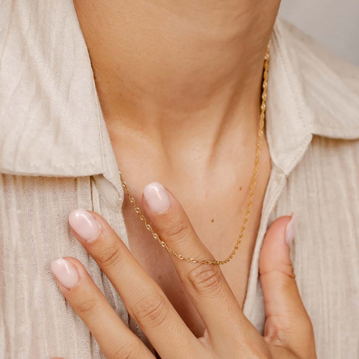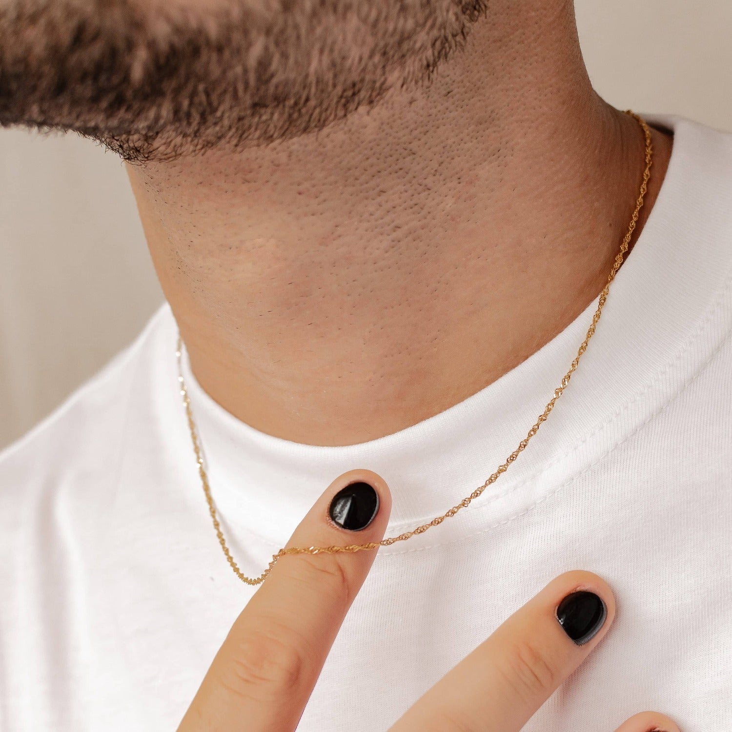This is a fine, Singapore style chain, made from 18 karat gold-plated sterling silver, which features a series of interlinked segments, a round spring clasp at the center back, and a short extension chain with a small, solid, rounded tag at its end. Thanks to its durable and strong design, this chain is ideal to hold pendants. Try mixing and matching with our selection of pendants (sold separately) to create your favorite look. Also check out Cuban Link Chain Necklace Gold.