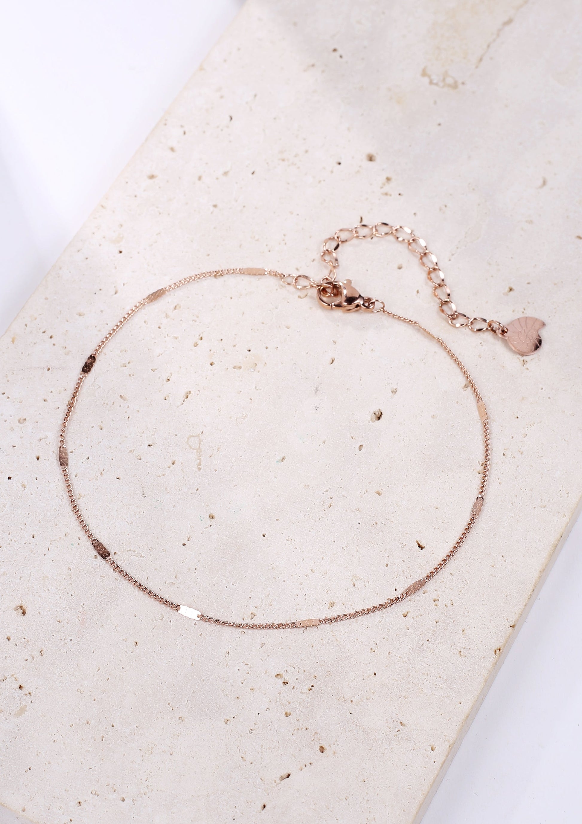 Made from rose gold-plated stainless steel, this chain anklet consists of sections of rounded curb-style chain links and sections of flattened chain links, creating a unique, textured look. An oval-shaped ‘lobster claw’ clasp fastens it together, along with a short extension chain which has a small shell charm attached to the end of it. A timeless and versatile piece that can be worn day or night. Also check out Double Curb Chain Bracelet Rose Gold.