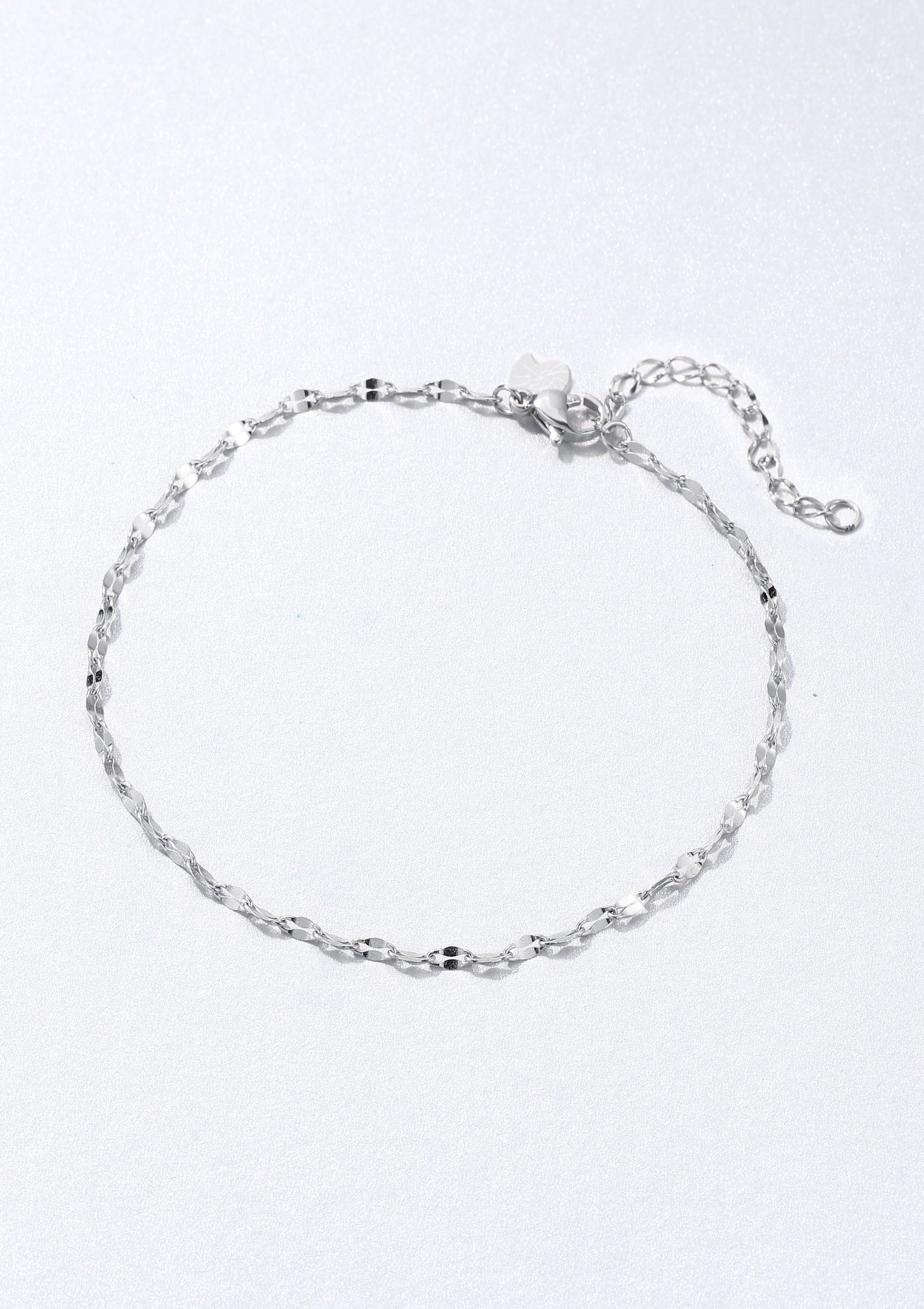 This is a silver chain anklet, made from stainless steel, which features small flattened ‘rolo’ style chain links all connected together. A small seashell charm is attached to one end of the chain, next to an oval-shaped spring clasp, and a single round link and short extension chain (made from regular chain links) is attached to the other. This is a modern, versatile, and adjustable anklet which will give your outfit that extra little bit of glitz and glamour. Also check out Flattened Rolo Chain Necklace Silver.
