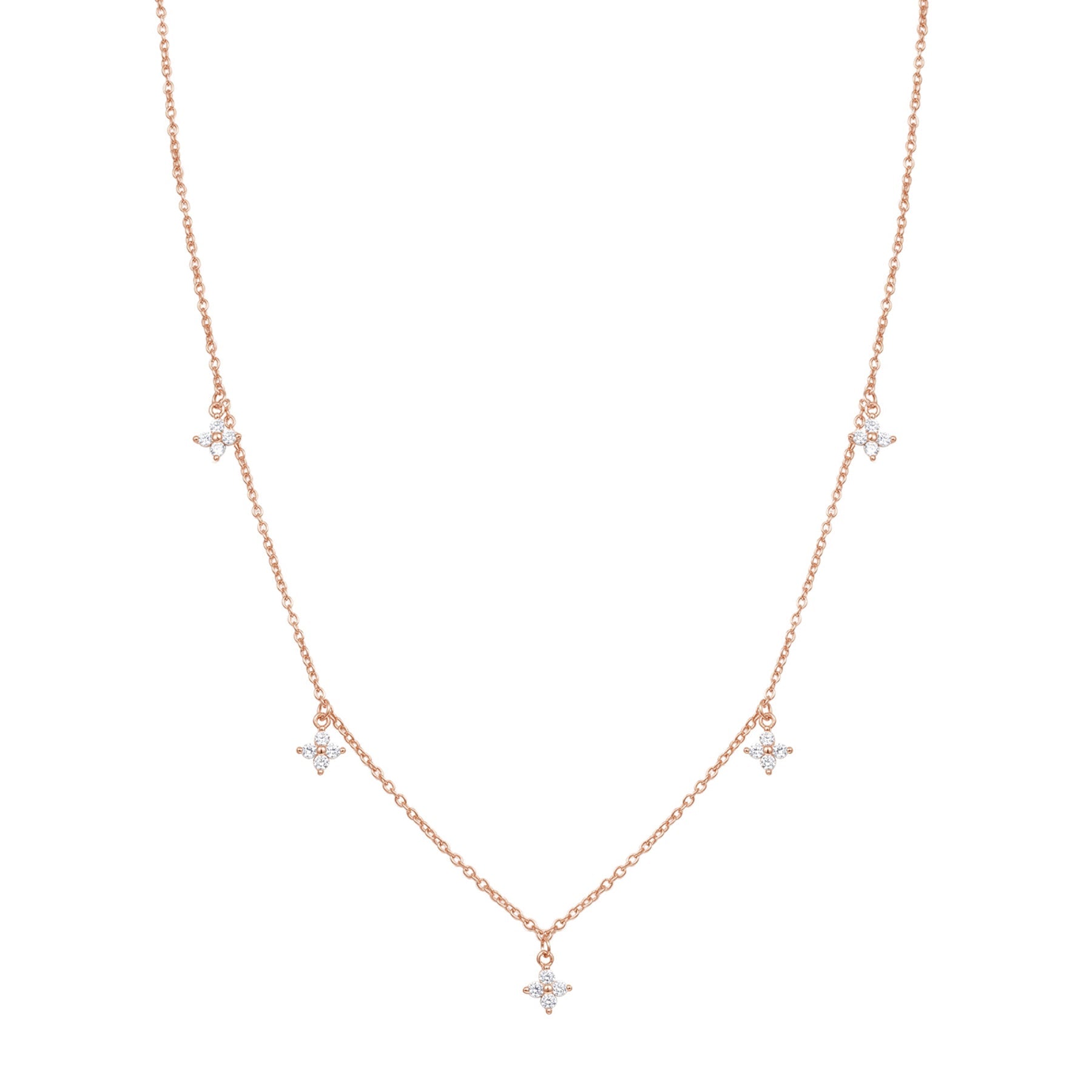 This delicate chain necklace is made from sterling silver and features five tiny charms attached to its front edge, each one made from four round zirconia arranged like a small flower. It closes at the center back with a spring clasp along with an extension chain, making the overall length adjustable. Stylish and feminine, this piece will suit small prints, flowy blouses and tiered summer dresses.