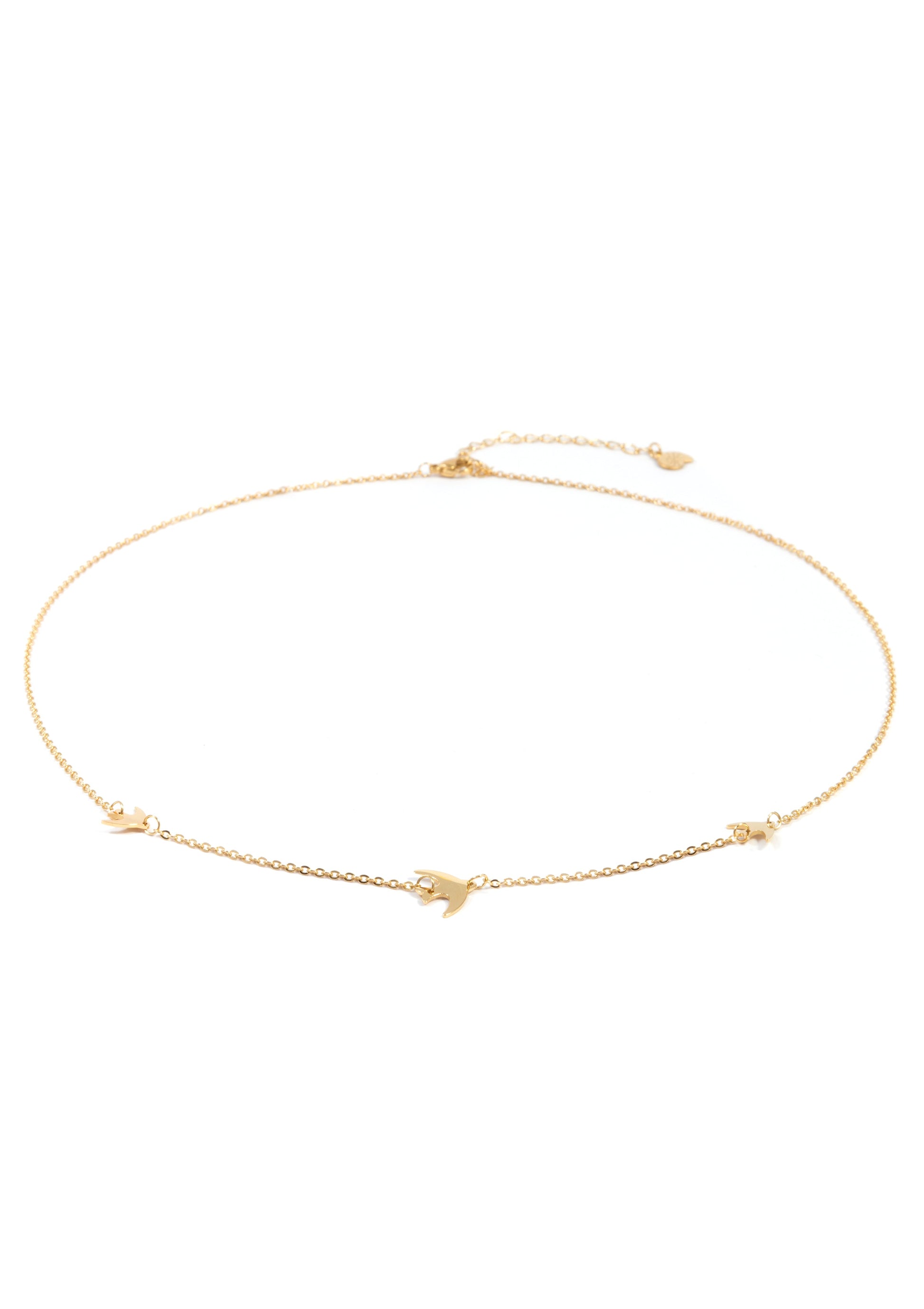 This all-gold necklace consists of a thin chain with three bird pendants spaced evenly along the front of it, all facing the same way. It has a lobster claw clasp at the center back, along with an extra length of chain with small seashell charm, allowing each wearer to find their desired length. Streamlined and modern, this necklace will work with an array of outfits. Also check out Flying Birds Necklace Rose Gold and Flying Birds Necklace Silver.