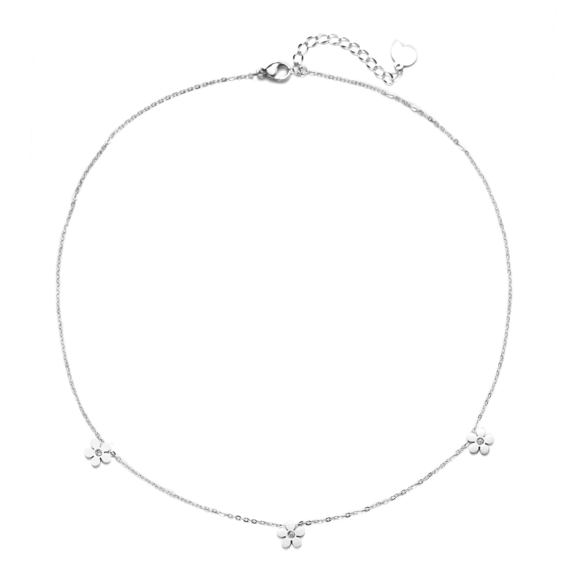 This is a fine silver chain necklace made from stainless steel, with three flower pendants attached to the front edge, each with five rounded petals and a round zirconia stone set in the middle. It fastens at the center back with an oval-shaped spring clasp and a short extension chain (with seashell pendant hanging from the end). Available to be purchased with matching stud earrings to complete your look. Also check out Flying Birds Necklace Silver.
