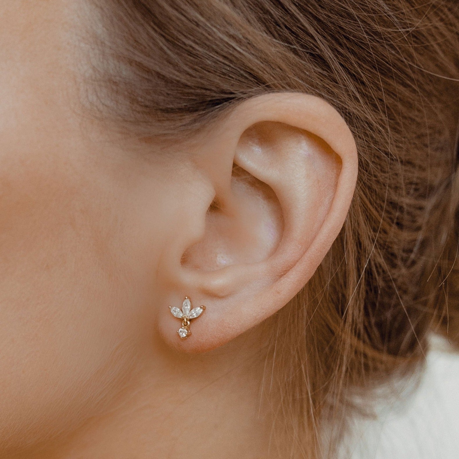 These are small stud earrings that are made from 925 sterling silver with 18 karat gold plating and which feature three clear-colored, oval-shaped, zircon stones set in a semi-circular shape, and a small round, clear-colored zircon stone hanging underneath. They fasten to the ear lobe with small butterfly clasps. Extremely classy and chic, these earrings will add a touch of understated elegance to any outfit.Also check out Gemstone Petal Huggie Earrings Sterling Silver Gold.