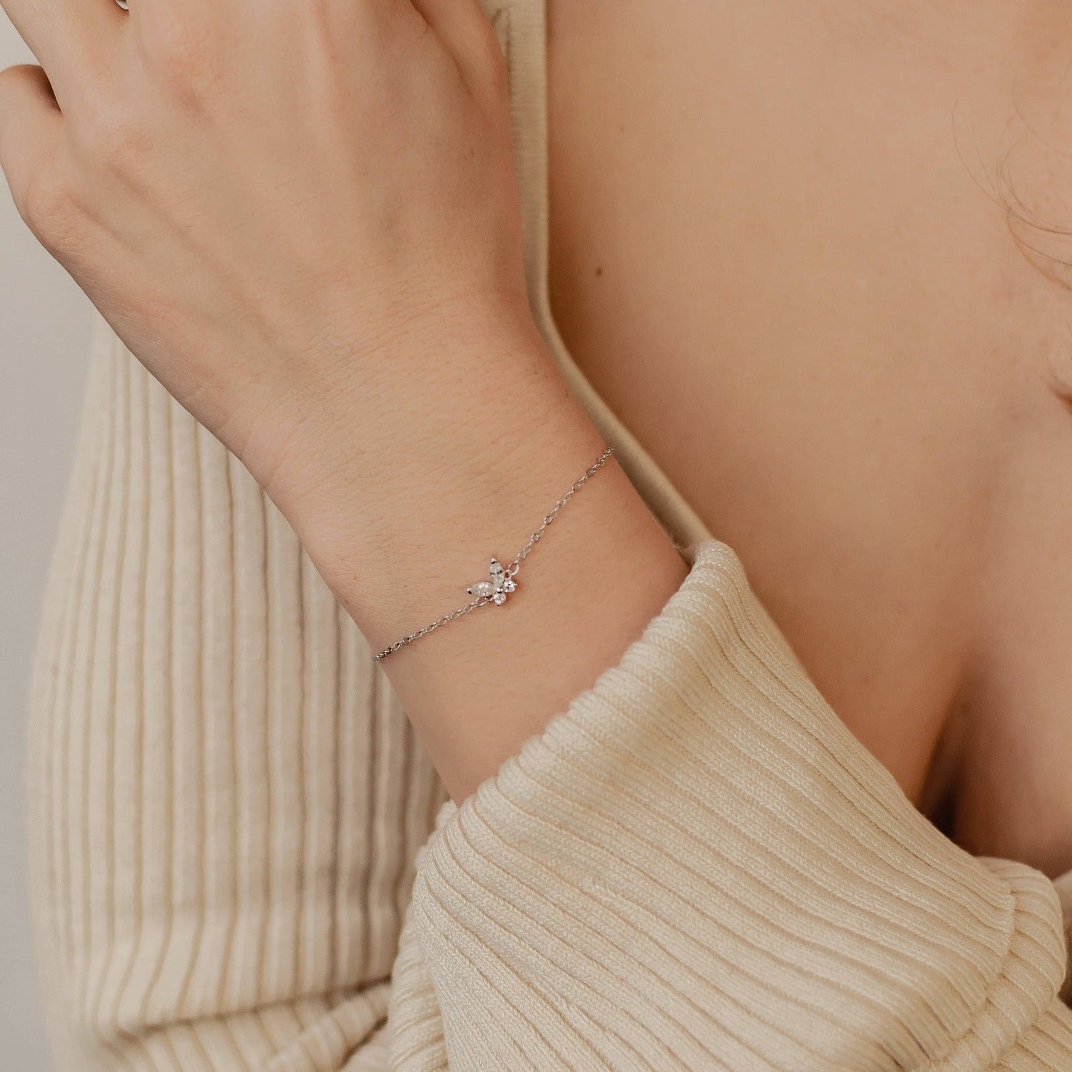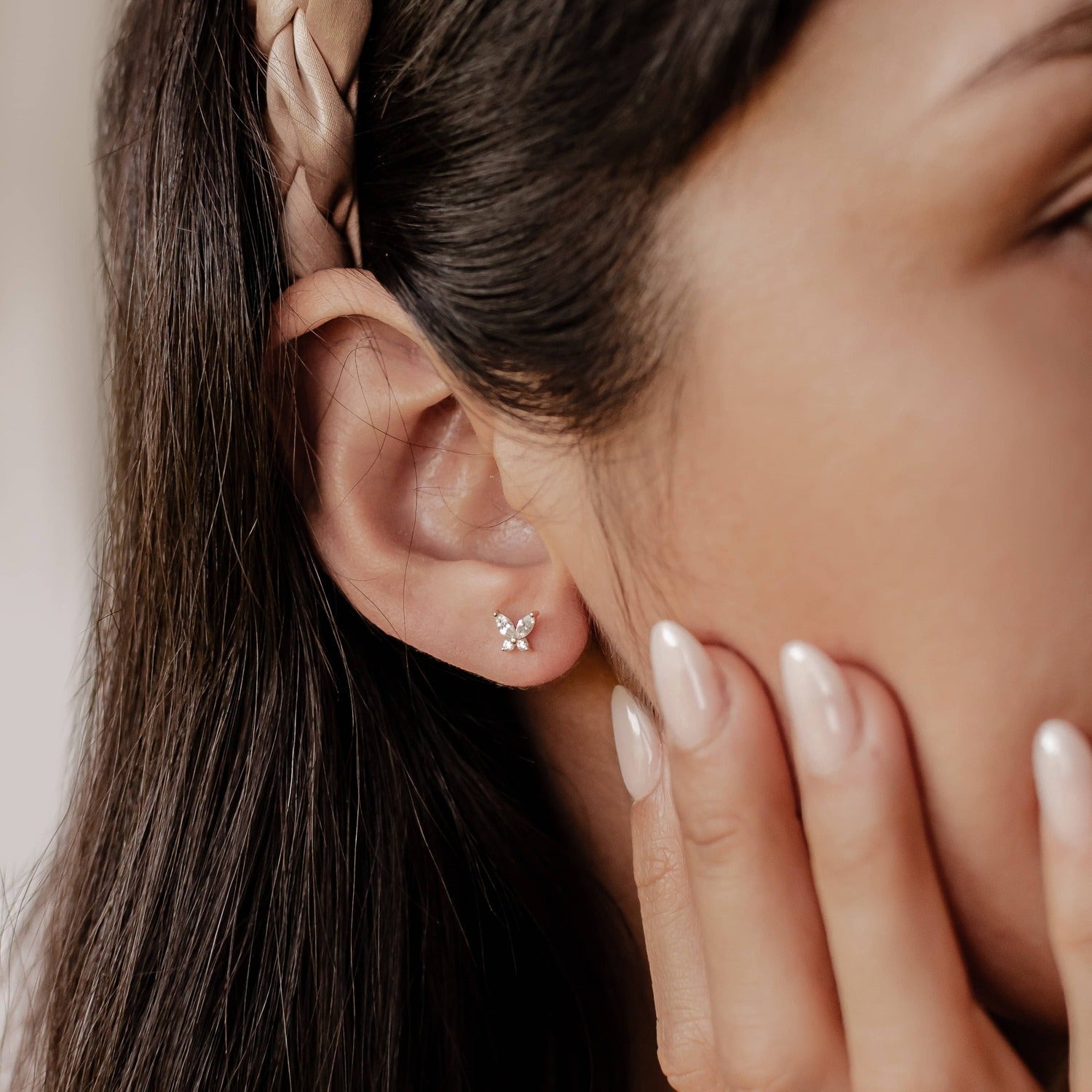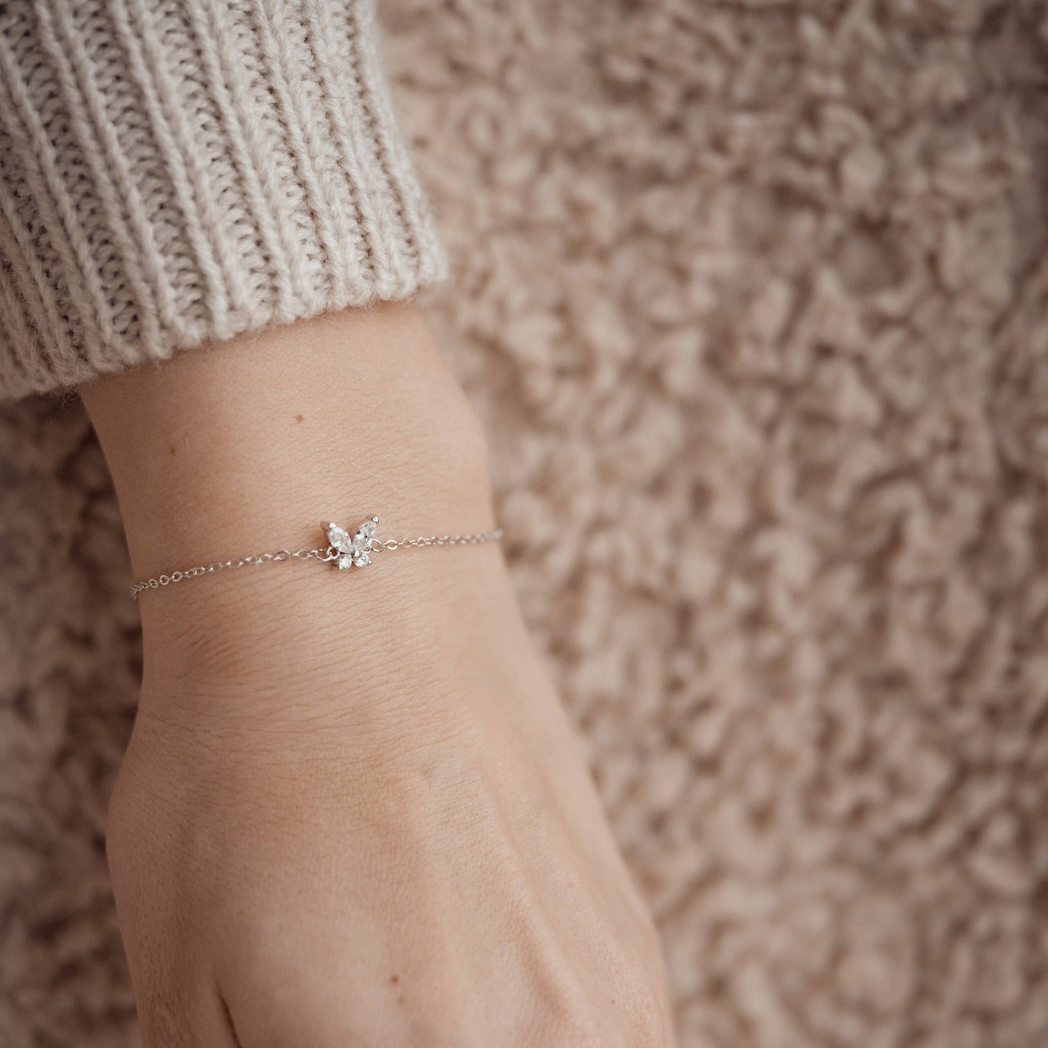 This elegant gemstone butterfly jewelry set consists of a necklace, earrings, and bracelet. Each piece showcases a beautiful butterfly design adorned with sparkling zirconia stones, all crafted from high-quality sterling silver. Choose between gold or silver for a glamorous and versatile addition to any outfit.
