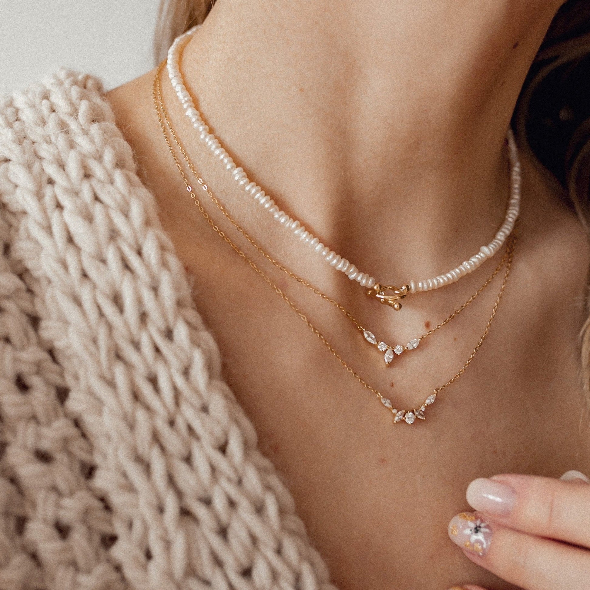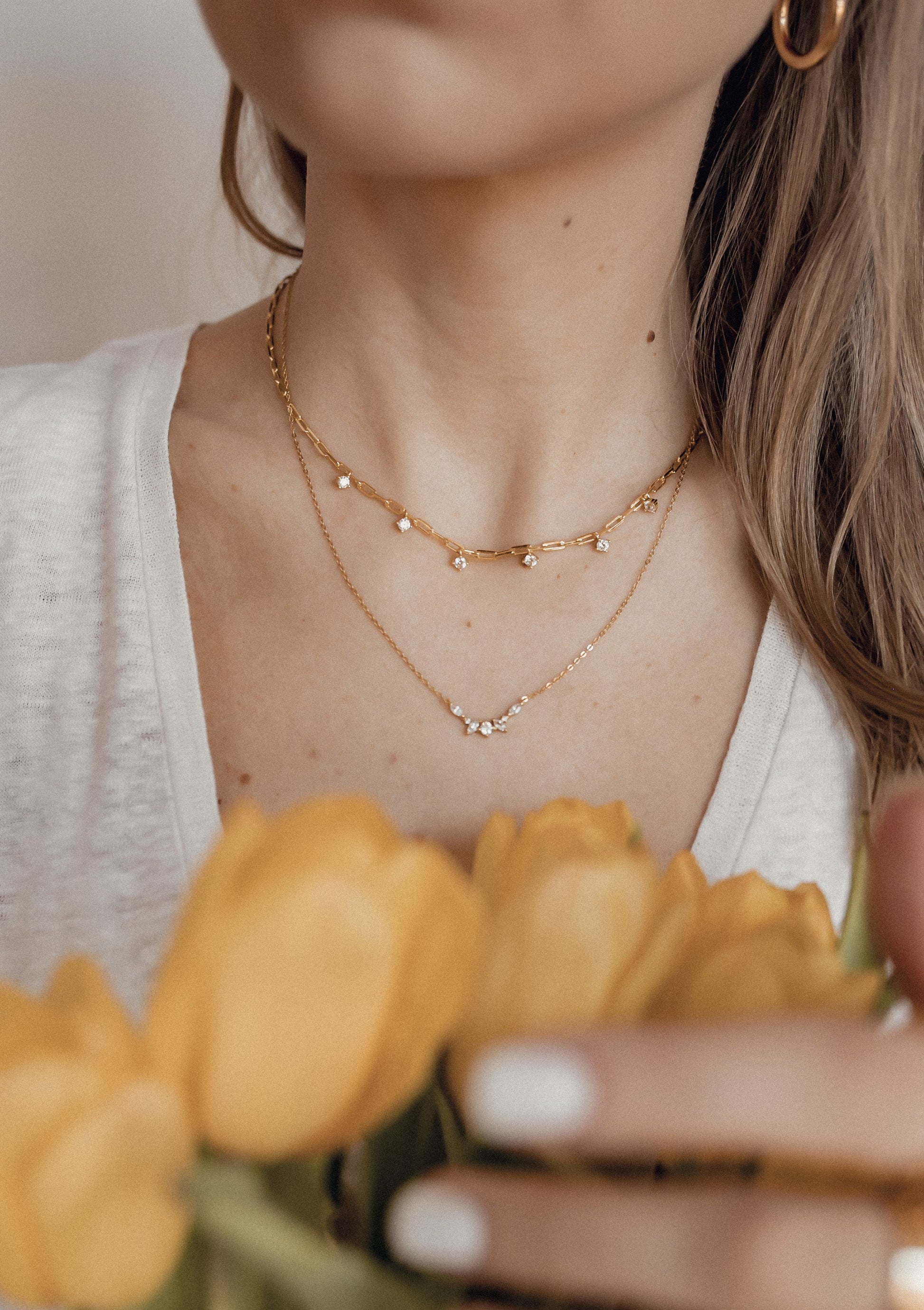 This necklace is made from 18 karat gold-plated sterling silver and features a super fine chain with seven clear-colored zircon stones (two small round, one large round, and four oval-shaped) in a gold setting at the center front. It closes at the center back with a round spring clasp and also has a short extension chain with a round tag at the very end, bearing a ‘925’ stamp of authenticity. This is an exquisite necklace that will add sparkle and grace to any outfit. Also check out Gemstone Butterfly Pendant Necklace Sterling Silver Gold.