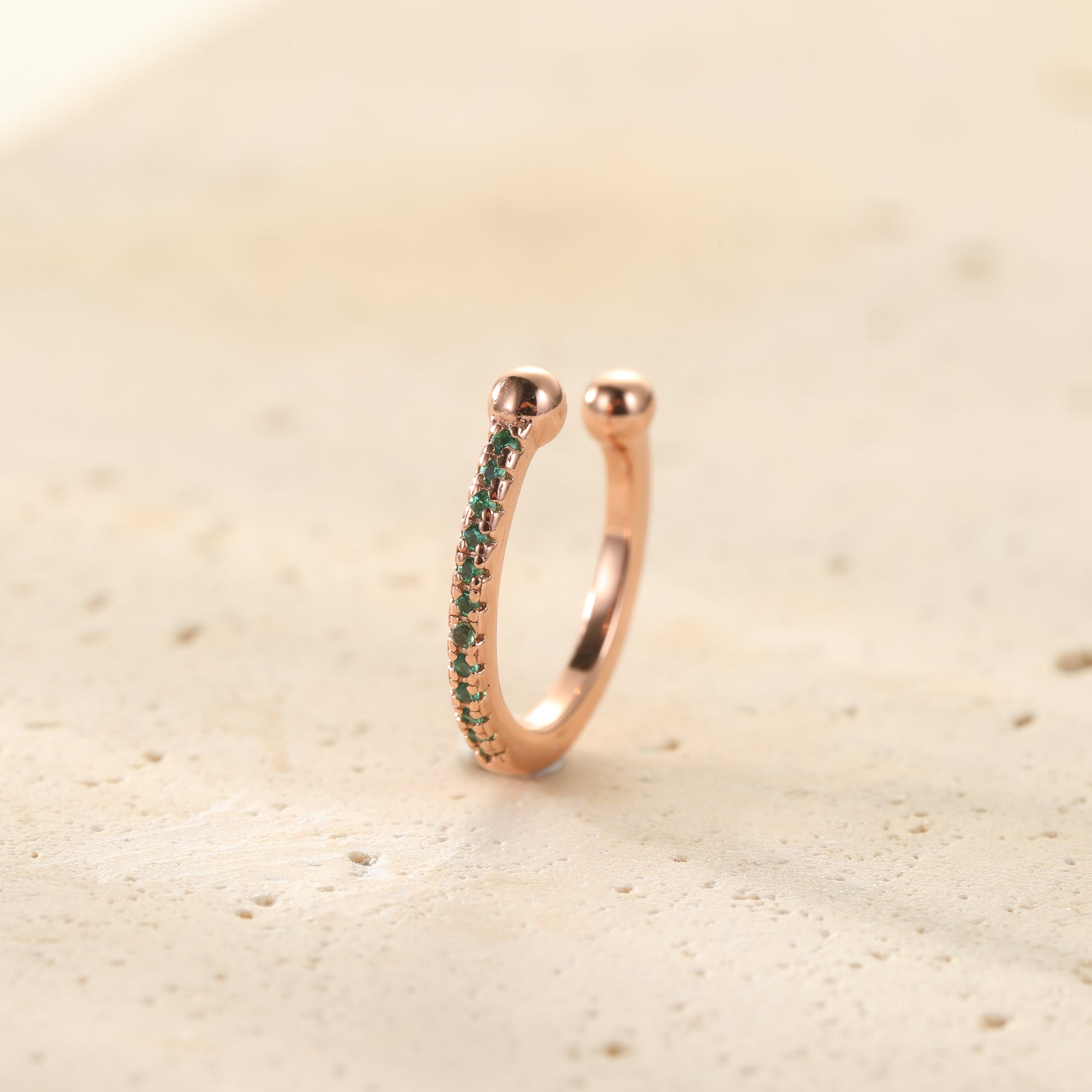 This 18 karat gold-plated sterling silver ear cuff features a sleek, squared-edge band adorned with shimmering green zirconia stones. A small gap with two metallic balls allows it to securely clip onto the ear without needing a piercing. Minimal yet striking, it's the perfect piece to elevate any look with a hint of color.