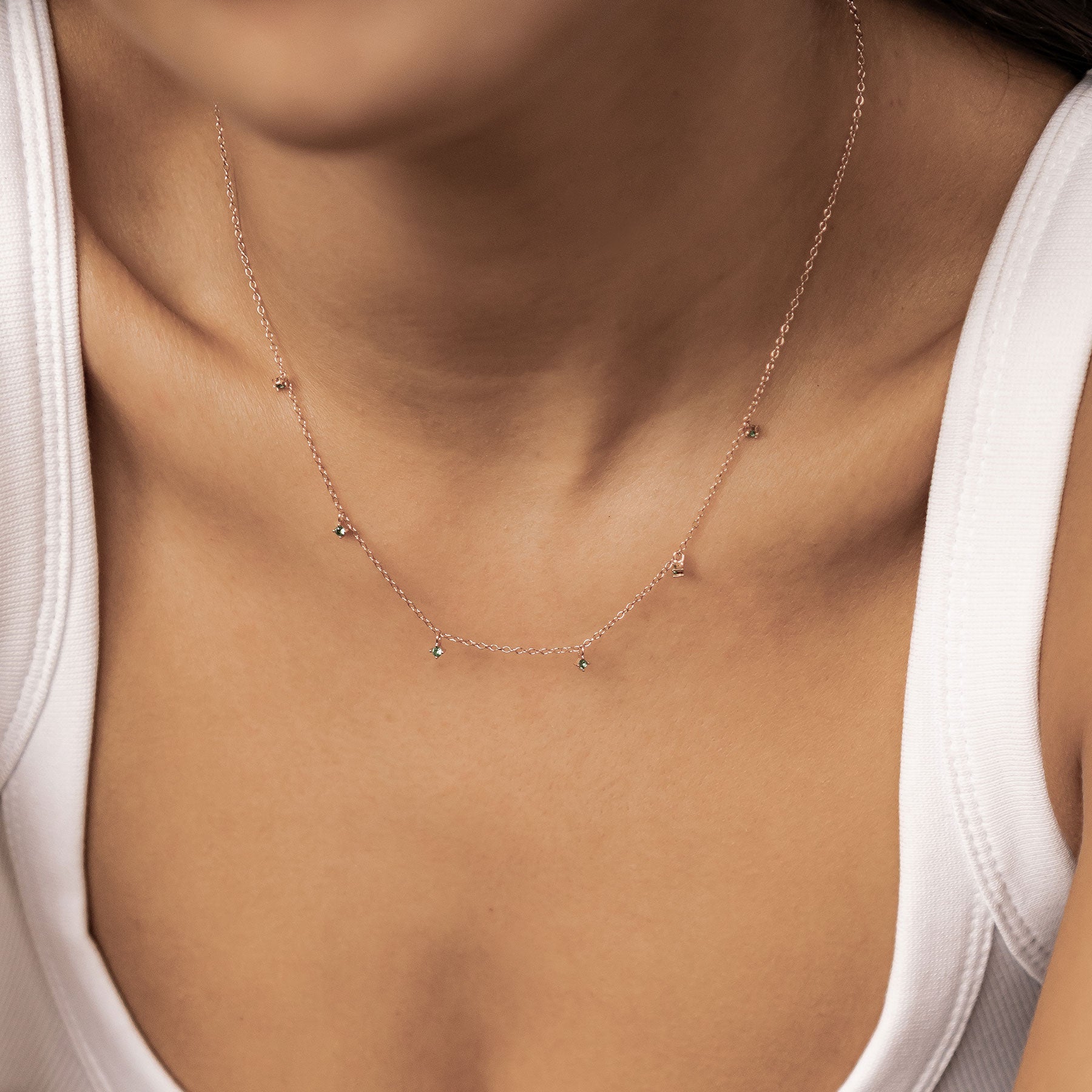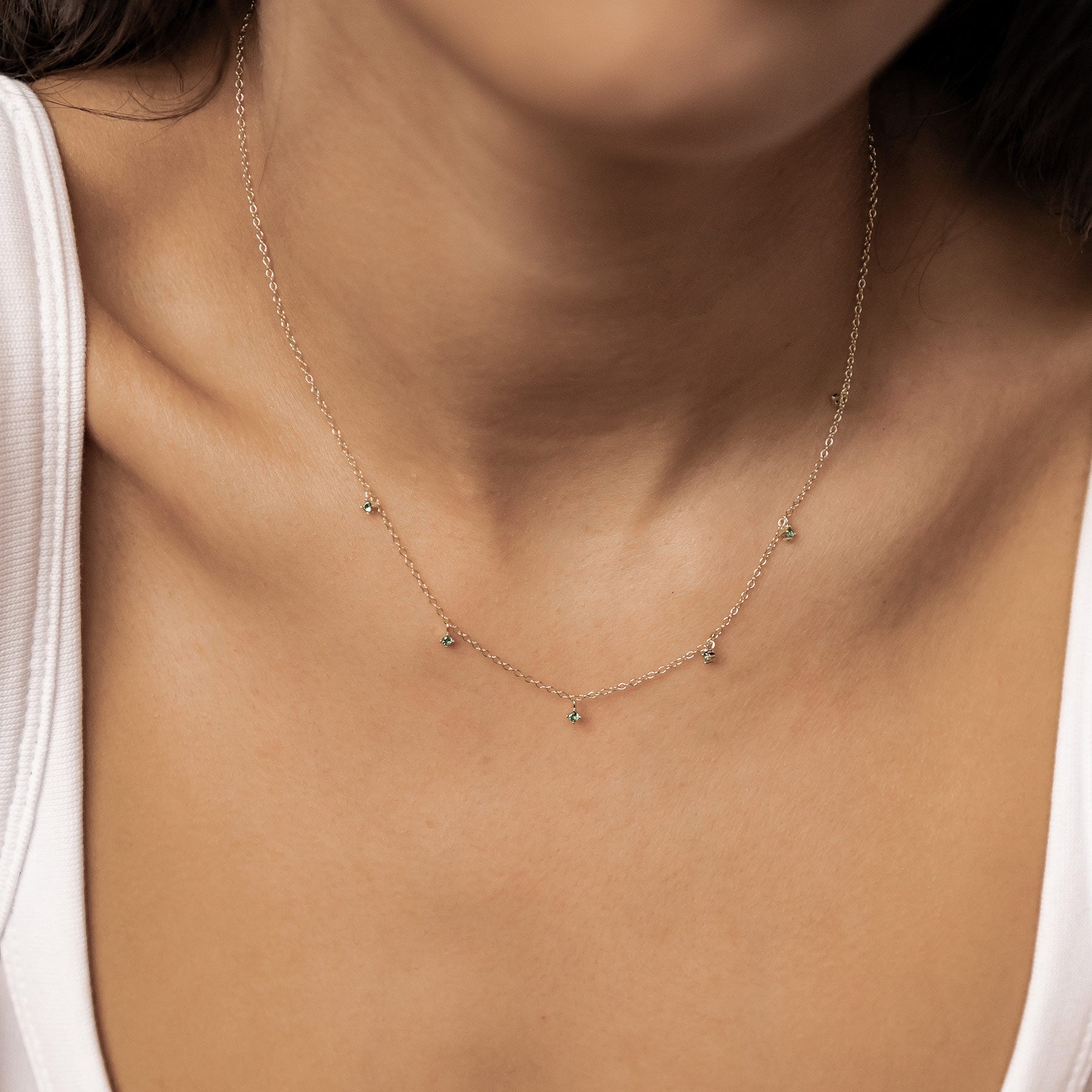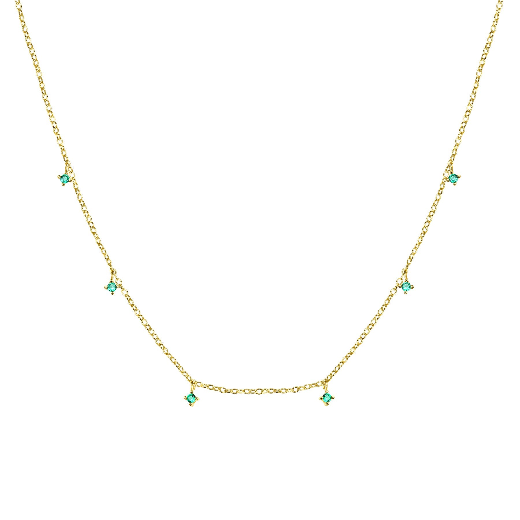 This delicate chain necklace is made from sterling silver and features six tiny green zirconia stones, each held in a four-prong setting, spaced along the front. It closes with a round spring clasp at the back and includes a short extension chain for a flexible fit. The subtle sparkle and pop of green make it a fresh, modern accent for everything from structured blouses to relaxed knits.