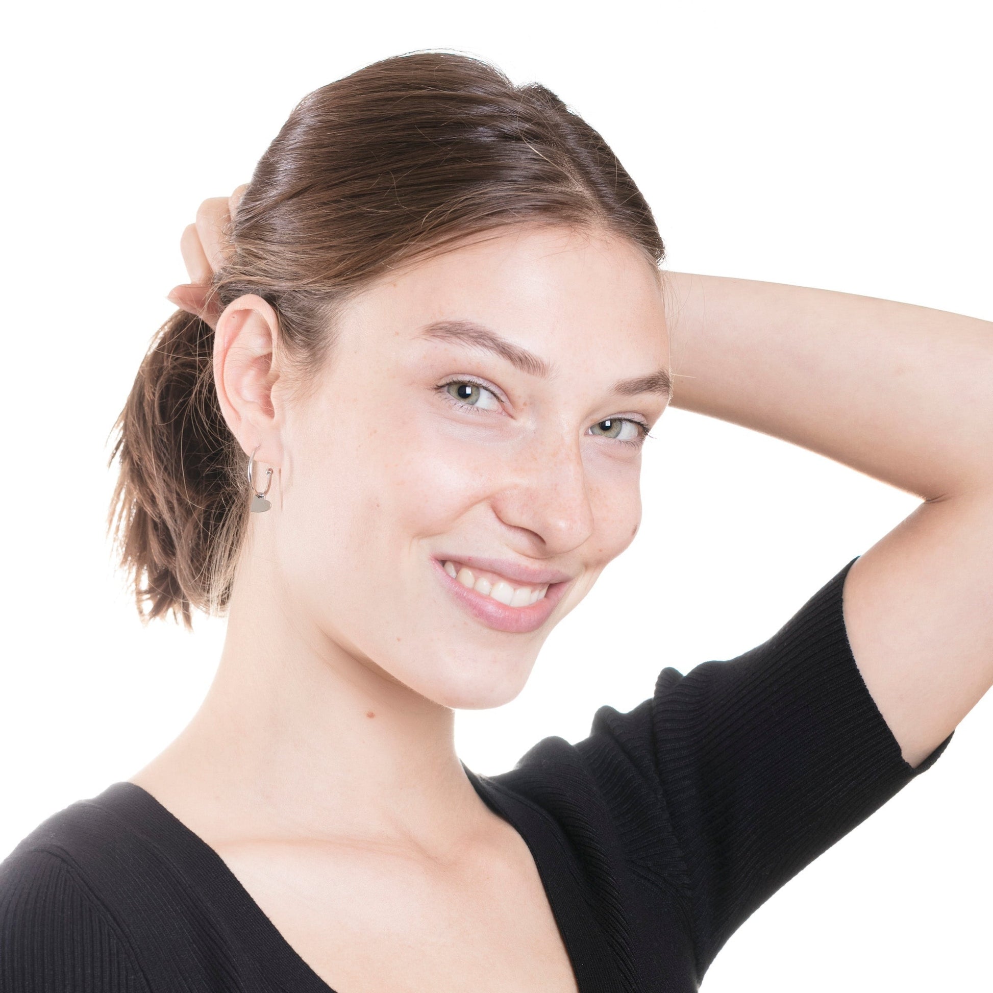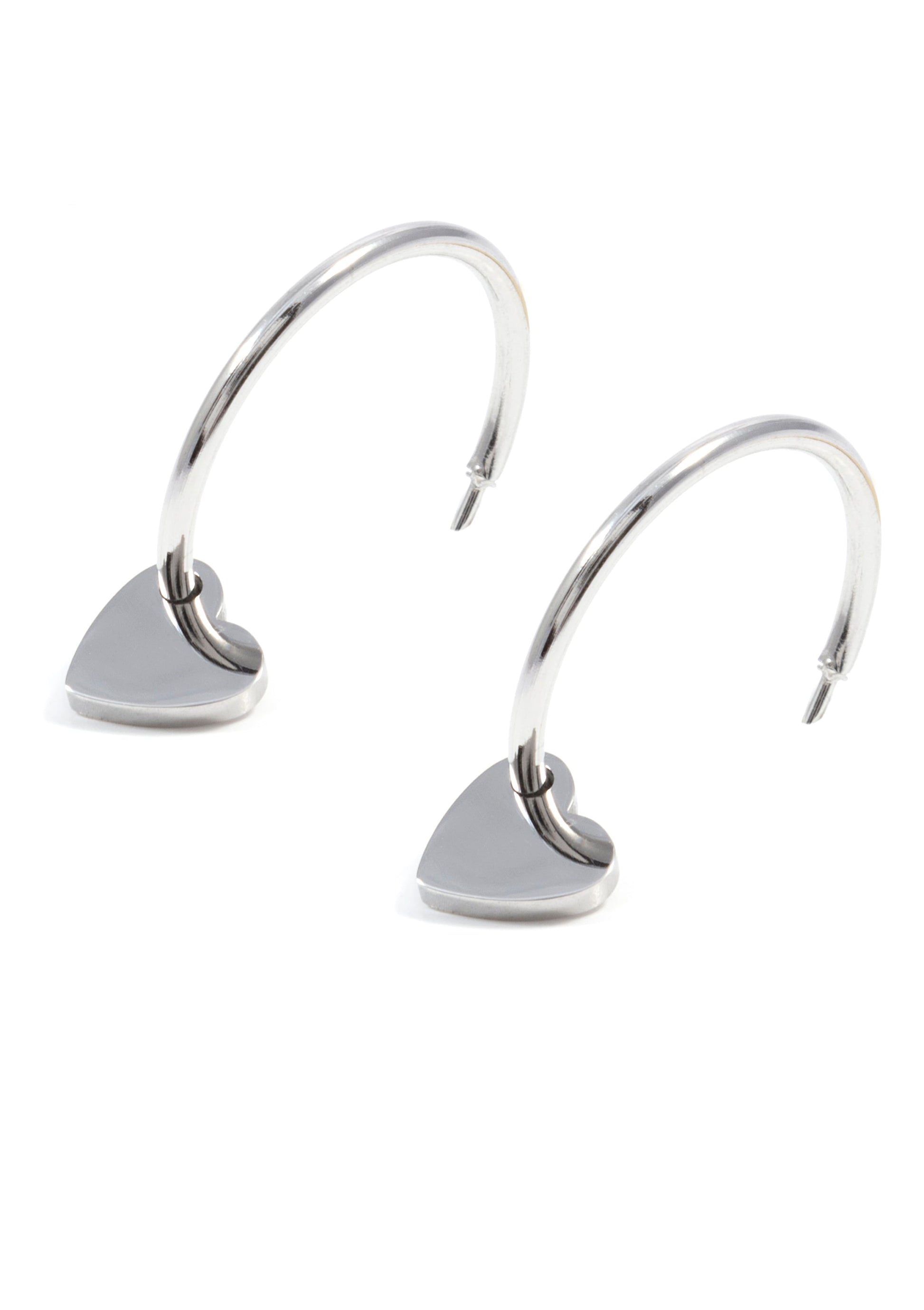 Made entirely in silver, these 3/4 hoop earrings are thin, feature a single small heart charm hanging from each, a small metal bead sitting at the open end of each hoop, securing the charms stay in position, and a silver butterfly clasp. This is a refined and classic design, that will add a touch of romance to your outfit, be it a button up blouse, distressed denim, or a tailored suit. Also check out Heart Charm Hoop Earrings Rose Gold.