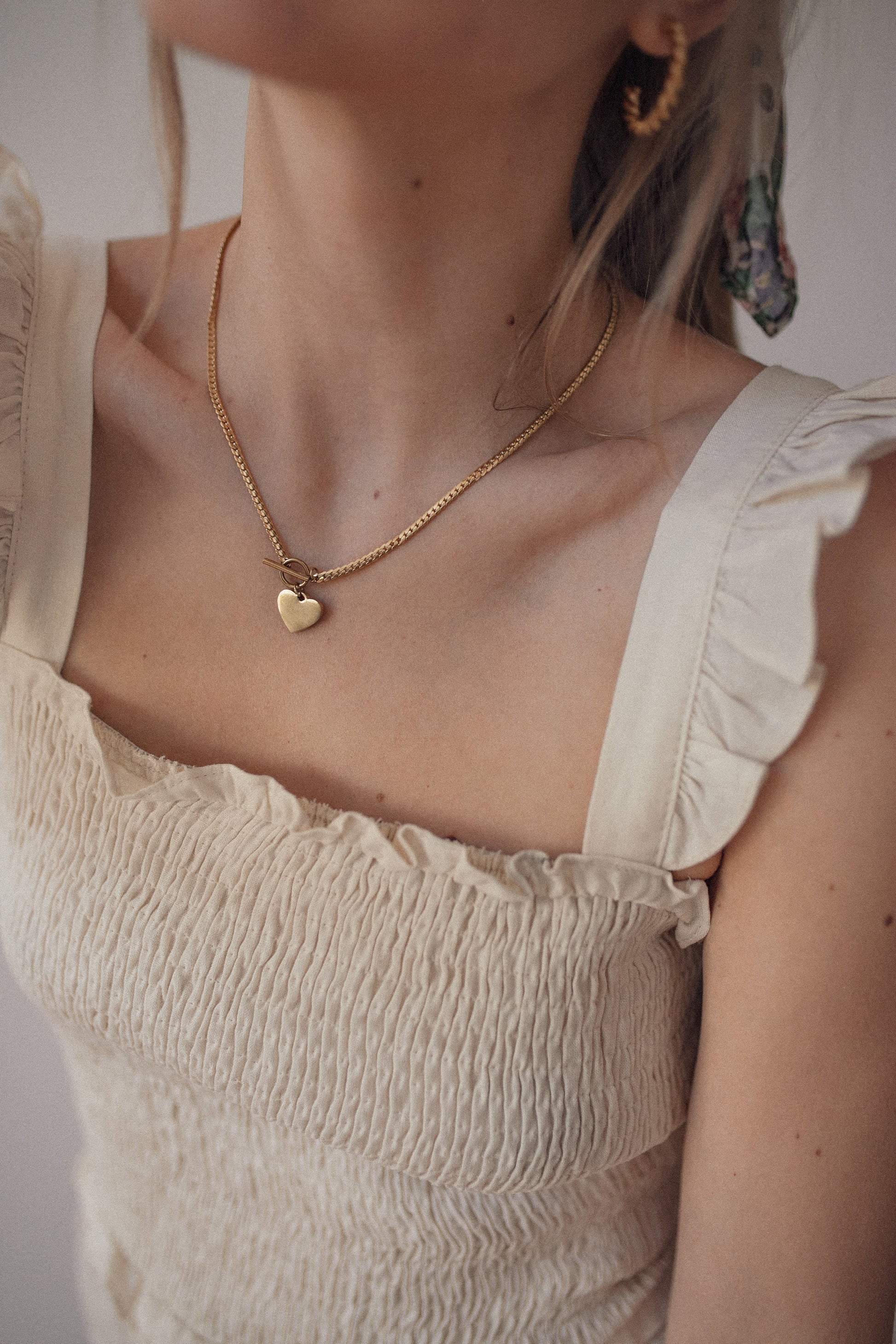 Heart Charm T-Bar Chain Necklace Gold
