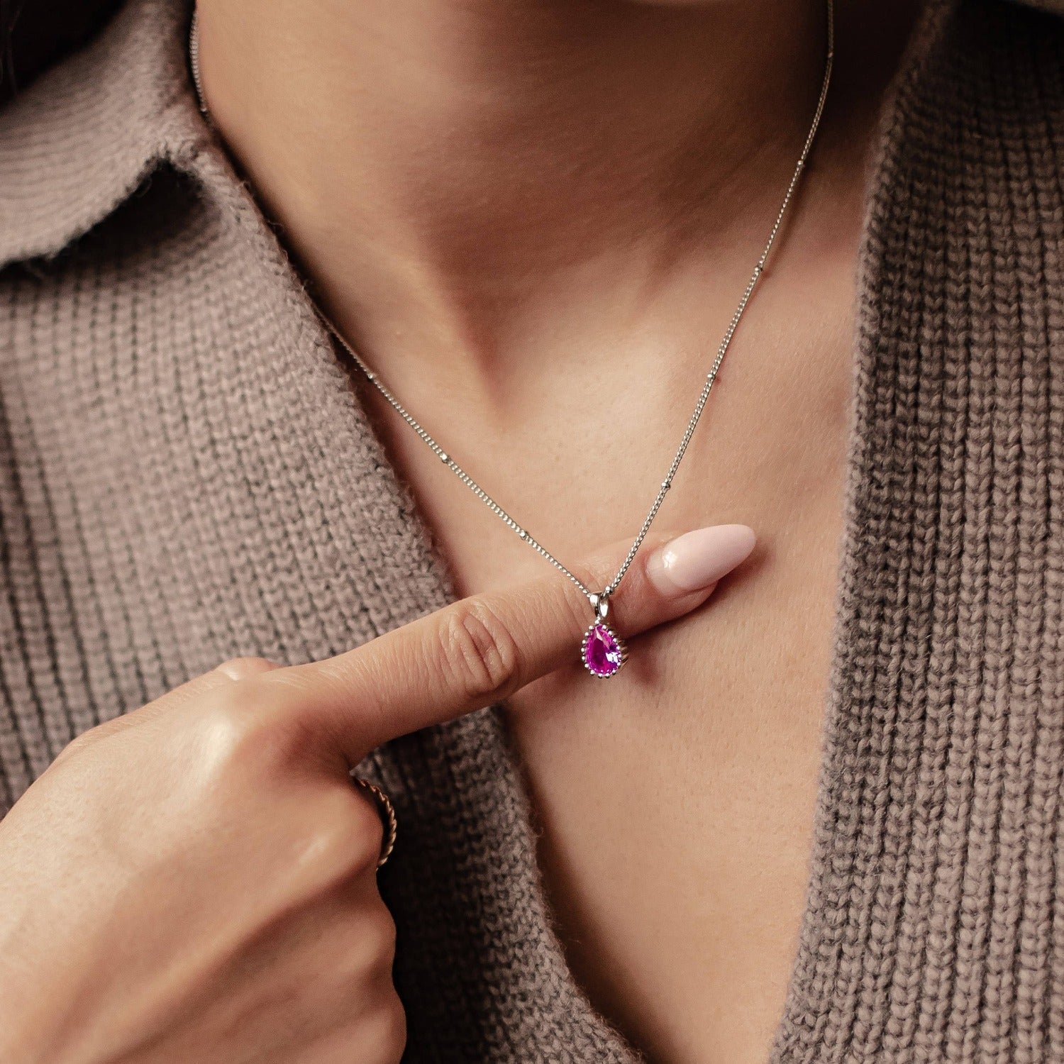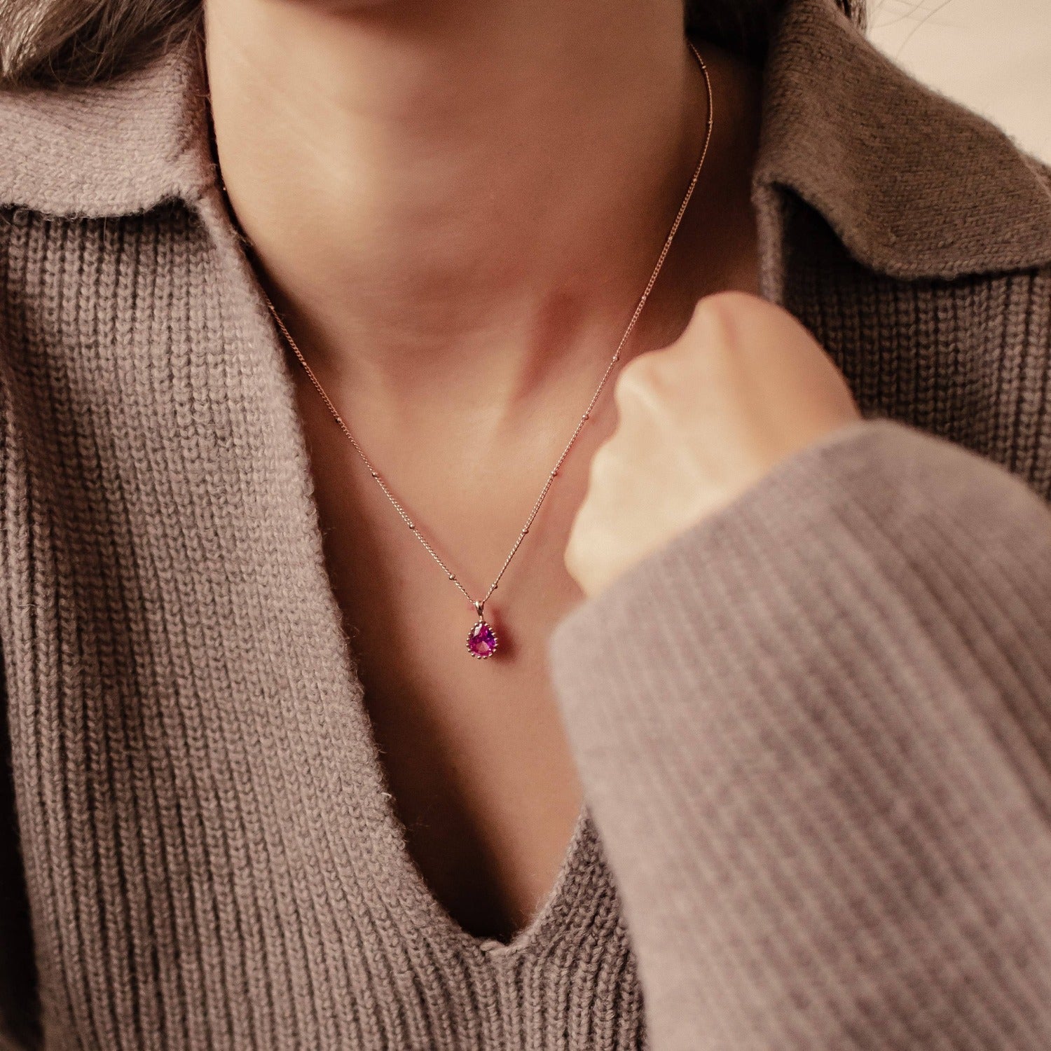 Harness the vitality of Rubies with this birthstone pendant. The dazzling synthetic gemstone is encased in sterling silver, and radiates an uplifting, invigorating energy. Those born in July are ruled by the zodiac signs Cancer and Leo, with their passion and ability to form deep connections being reflected in the fiery hues of this stone. Available in gold, rose gold and silver.