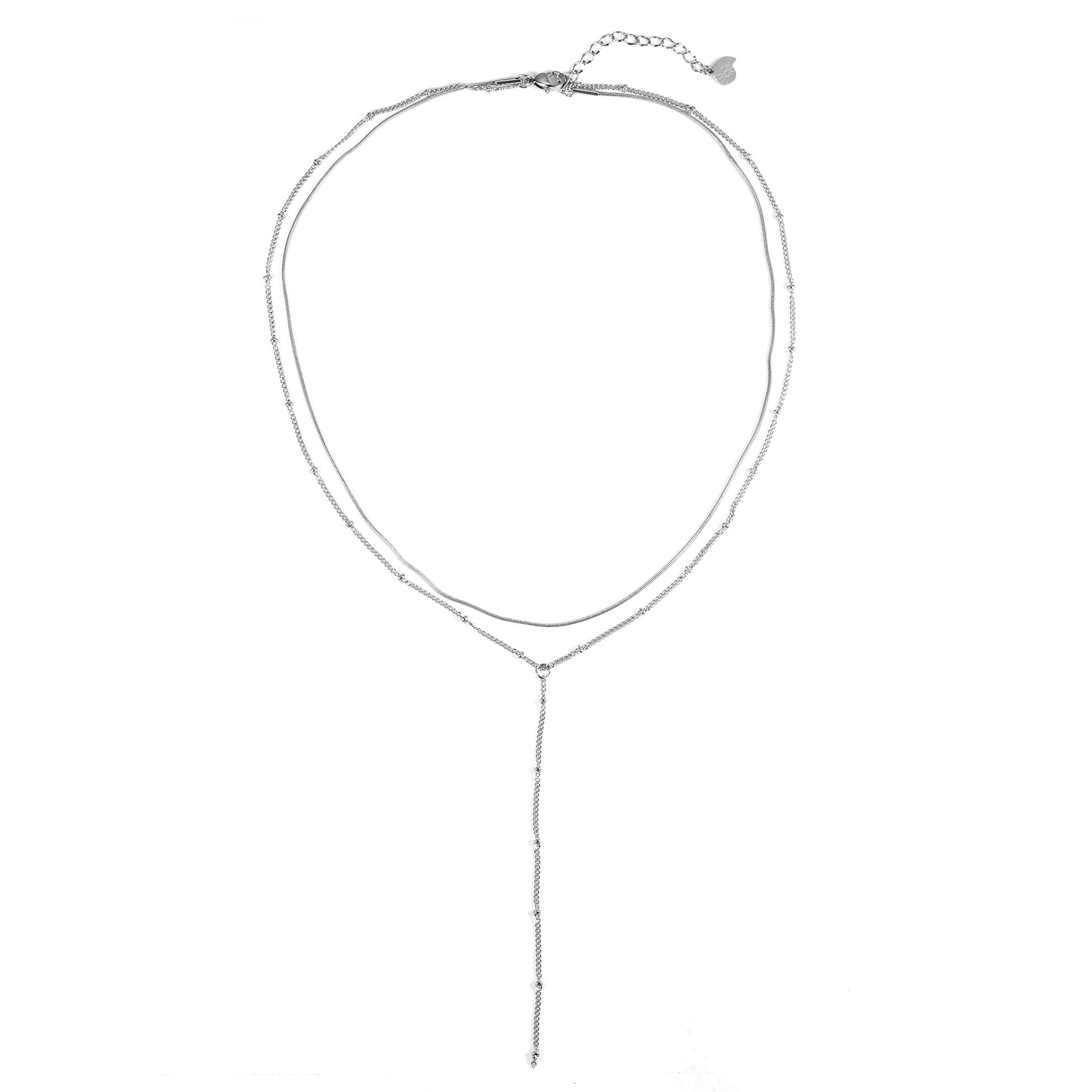 This beautiful Y necklace features a layered design - a snake chain that sits higher on the neck and a satellite chain with a vertical "tail" when worn. Made of stainless steel, it comes in 3 timeless colors - gold, rose gold, and silver. Also, check out Flattened Chain Link Y Necklace Gold.