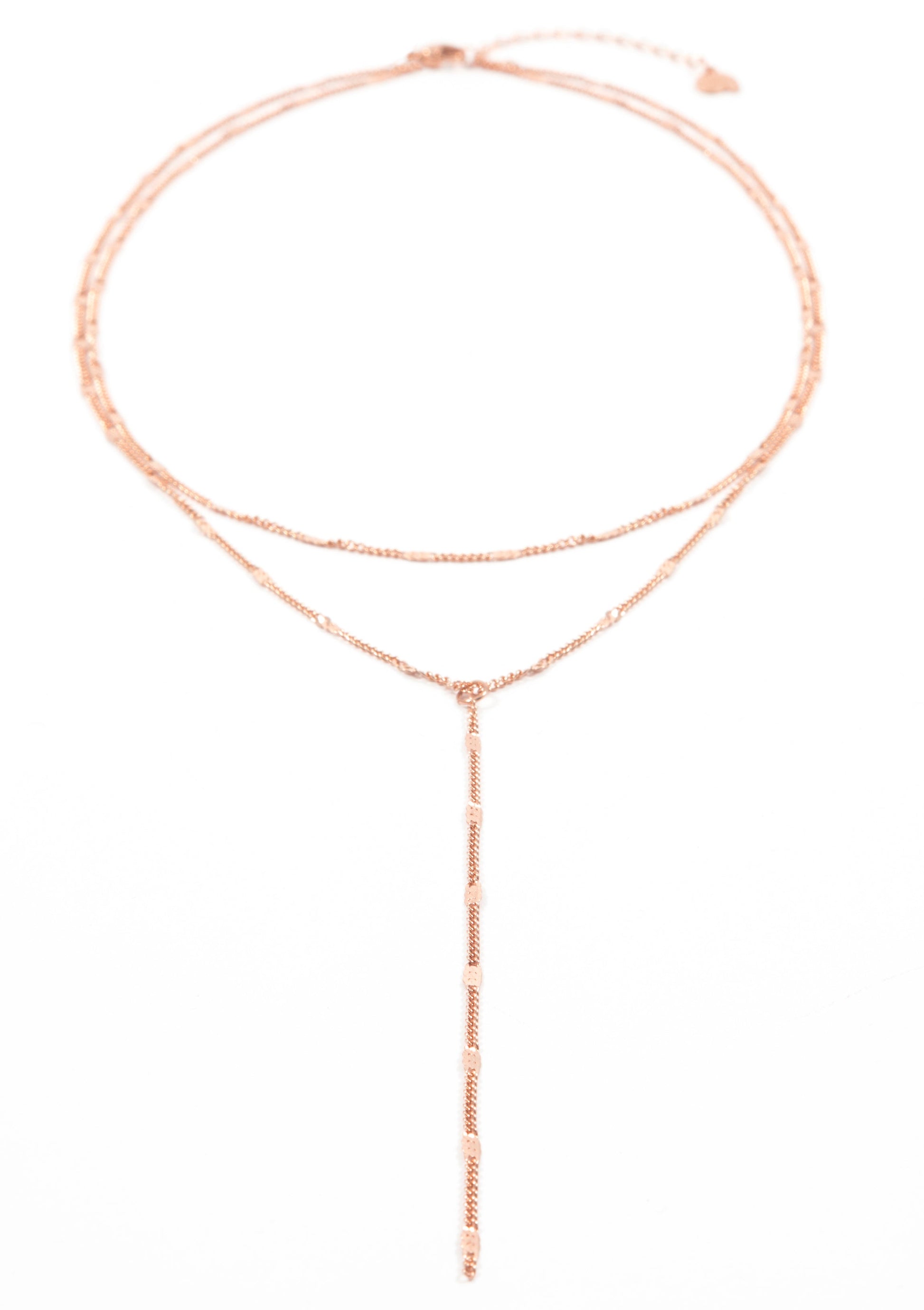 This necklace consists of two different rose gold chains: one simple, shorter chain, and one longer, Y-shaped chain which sits lower down on the neck, the tail end hanging below. Both chains feature a unique link design, where three flattened links are evenly spaced out along its length, and they both come together at the center back where a lobster claw clasp fastens the necklace. An extra length of chain (with hanging shell pendant) also sits at the back, making the overall fit adjustable. This necklace is completely charming and elegant, and would add the finishing touch to your next special outfit. Also check out Layered Y Necklace Gold and Layered Y Necklace Silver.