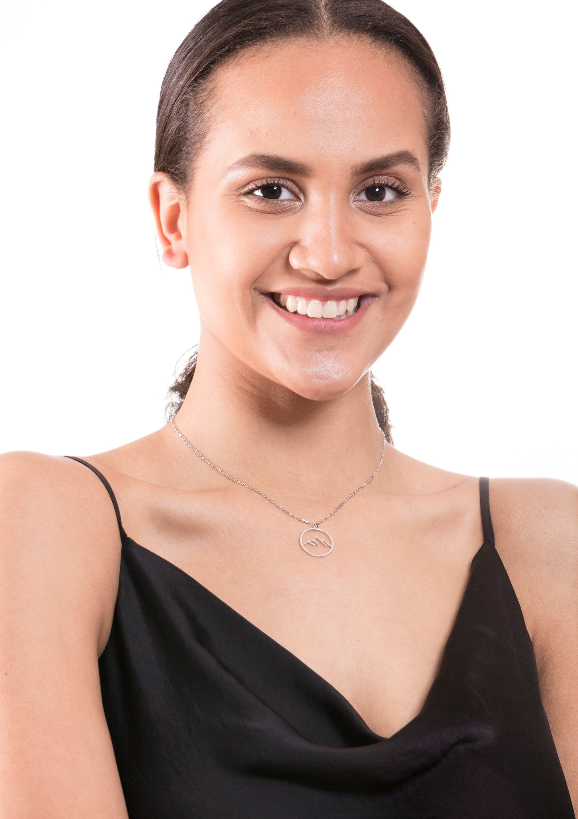 This all-silver necklace has a round, hollow pendant with a cut-out mountain range design hanging from a thin chain. A lobster claw clasp fastens the chain together at the center back, along with a short length of chain with a small seashell charm, which means the overall fit can be customised to each wearer. This is an eye-catching design that is special enough to wear with formal wear, yet still subtle enough to wear together with casual outfits as well. Also check out Mountain Necklace Gold and Mountain Necklace Rose Gold.