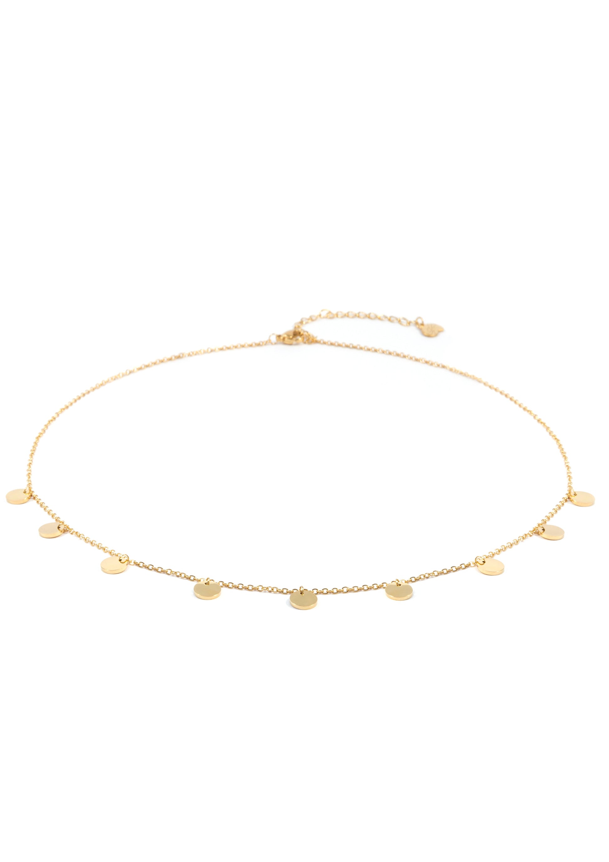 This all-gold necklace consists of a thin chain, nine circular pendants attached at even intervals to the front side of it, and a lobster claw clasp closing at the center back. It also has an additional length of chain, with larger links and a hanging seashell pendant at the back, allowing each wearer find their ideal length. Classy and timeless, this necklace is a versatile piece that will pair well with anything from smart, tailored pieces to vintage wear. Also check out Multi Circles Necklace Rose Gold and Multi Circles Necklace Silver.