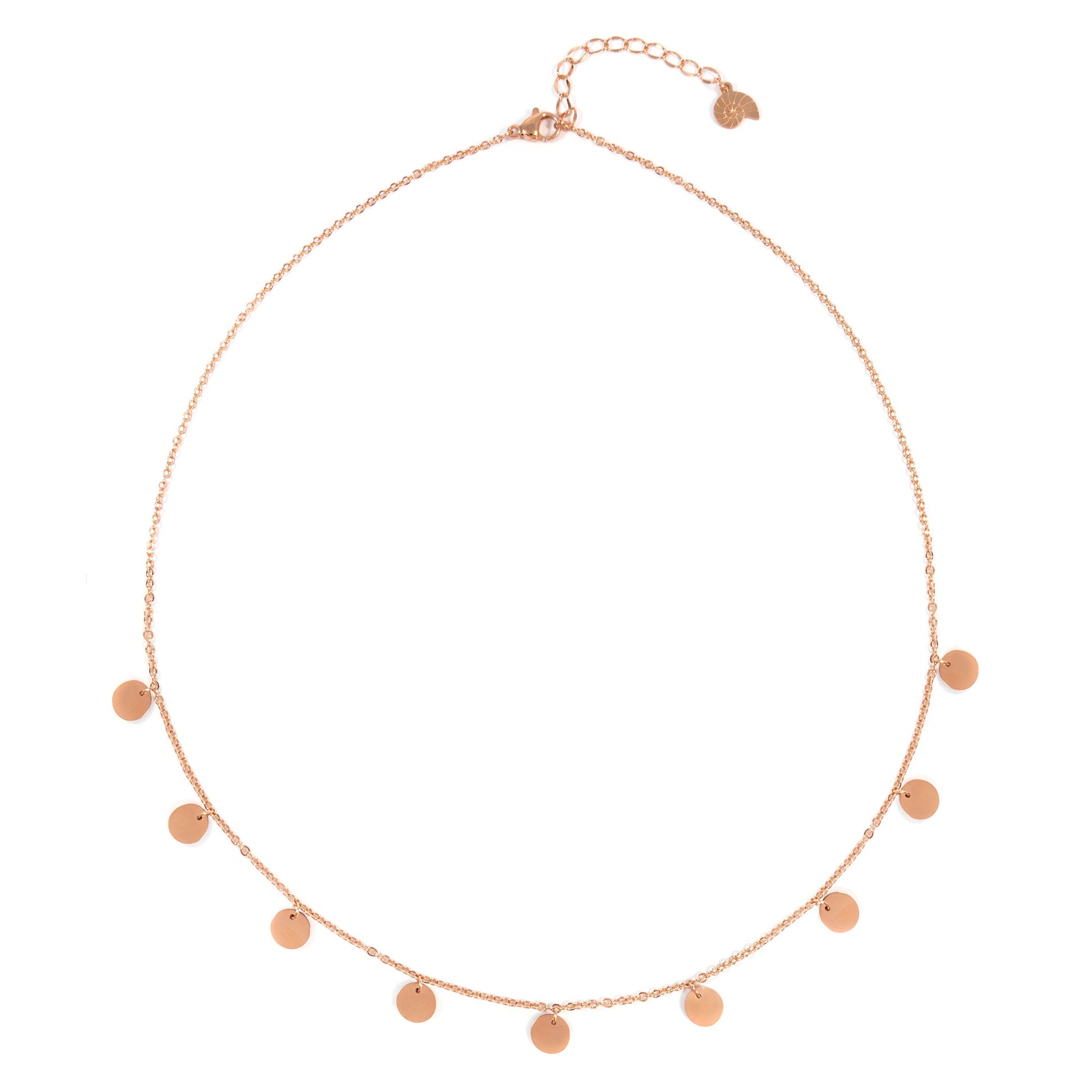 This thin rose gold chain necklace has nine round pendants attached to the front side of it, all the same size and evenly spaced along. A rose gold clasp sits at the back, along with an adjustable length of chain and signature Hey Happiness seashell charm. Understated, modern and versatile, this necklace will easily become the go-to piece in your jewelry collection. Also check out Multi Circles Necklace Silver and Multi Circles Necklace Gold.