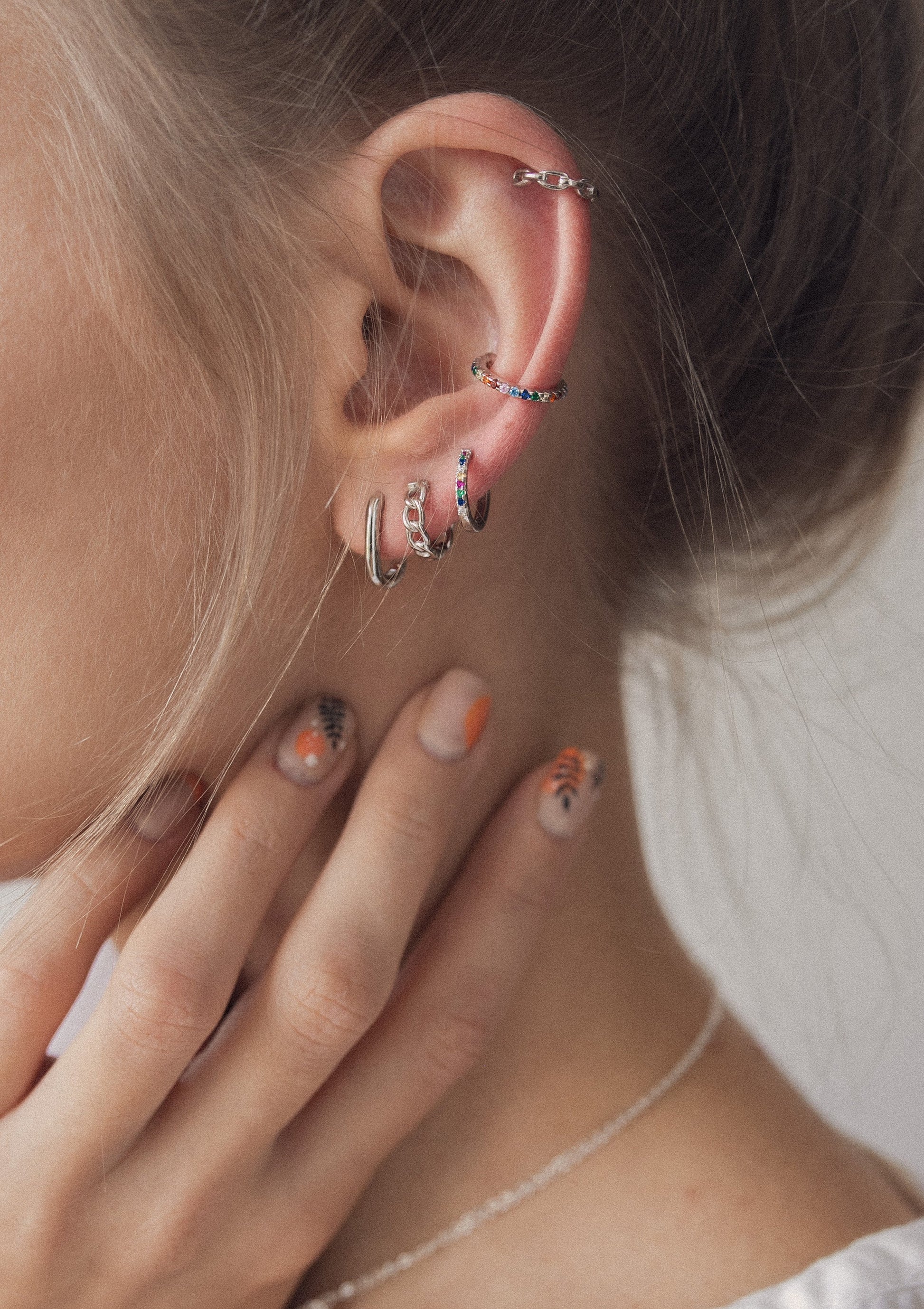 These are huggie earrings which are made from sterling silver and which have nine small multicolored stones (red, blue, green, white, and yellow) set along the front edge of a small hoop. A thin, hinged earpiece makes them a breeze to put on and take off again, and their lightweight design makes sure they are comfortable enough to wear all day, everyday. Glamorous and modern, these huggies will suit practically any outfit, from casual denim and slouchy pullovers to fitted dresses and tailored jackets. Also check out Clear Stone Huggie Earrings Sterling Silver.
