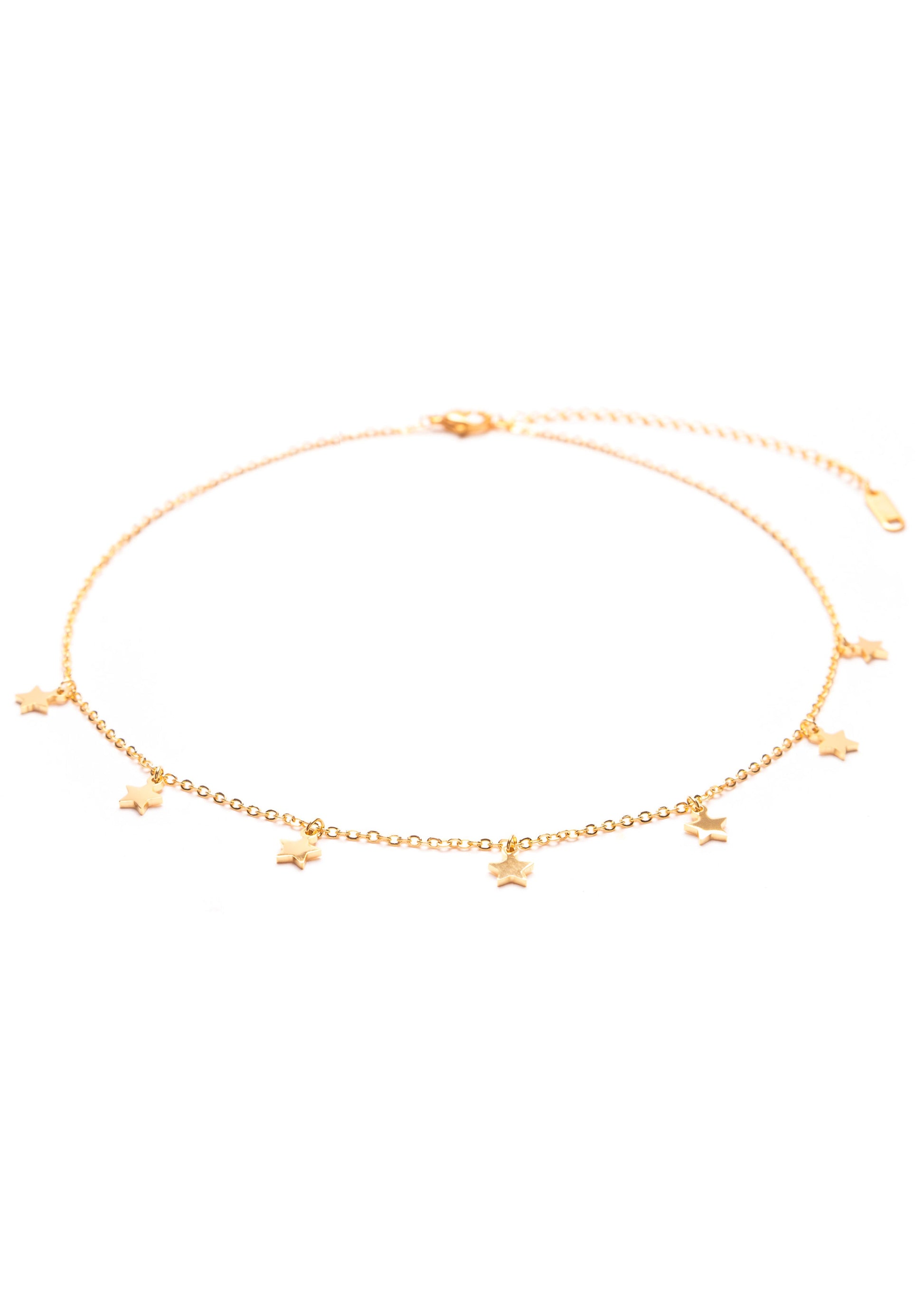 This set consists of three separate necklaces—all of them fine, gold and featuring thin chains—sitting at various lengths, creating a textured and fashionable stacked look. The necklace we’ve styled highest on the neckline has seven small star charms, followed by a necklace with a single crescent moon pendant sitting below that, and lowest of all, we have a double-stranded chain with tiny metallic balls dotted all the way along its length. All three necklaces feature a lobster claw clasp at their center back, and have an extra short length of chain with attached shell pendant, which means they can all be shortened or lengthened, depending on your taste. This is a super elegant look, and we encourage you to play with how you layer them together and with what you wear them. Also check out Celestial Inspiration Necklace Set in Rose Gold.