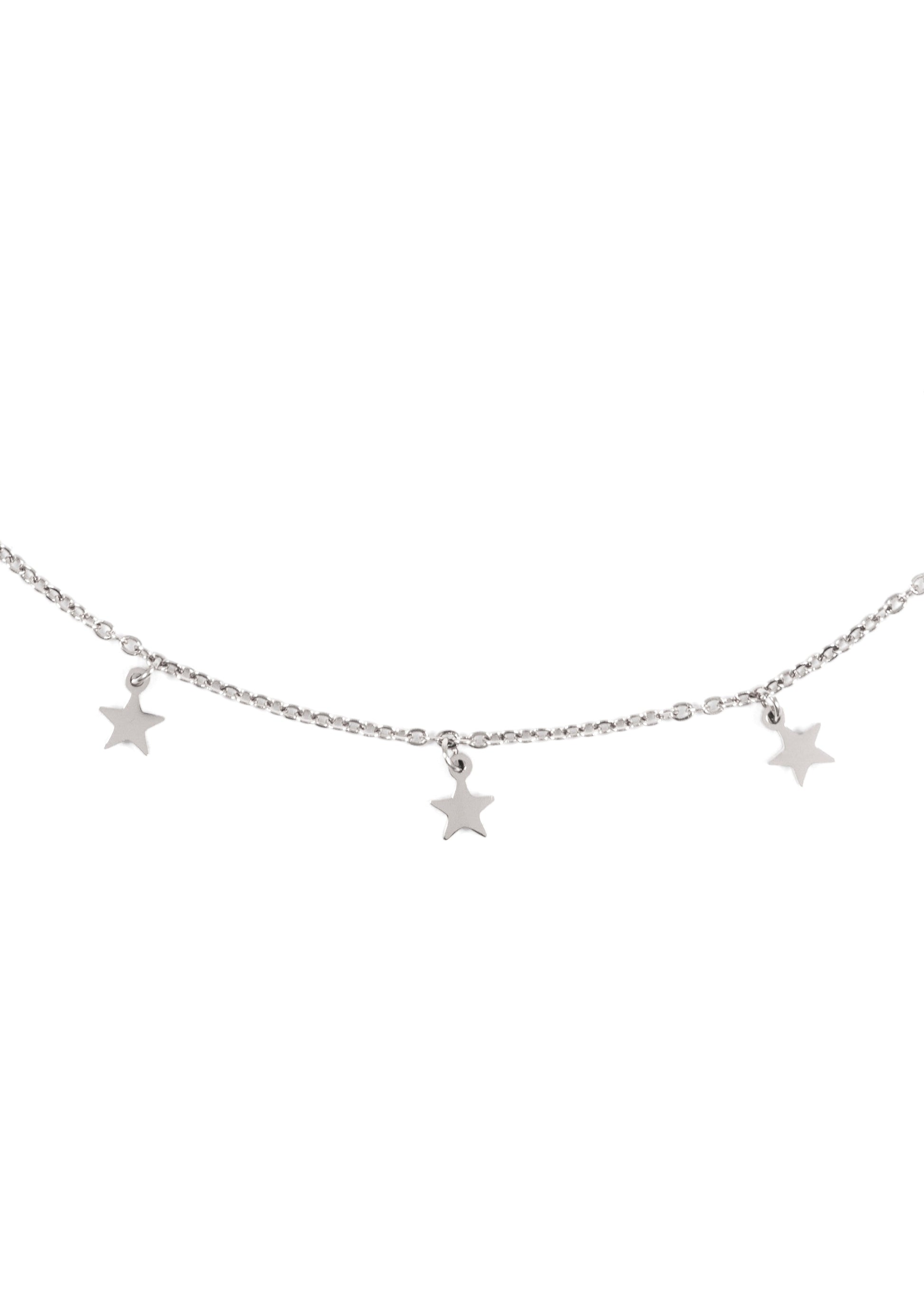 This set consists of 3 separate necklaces—all of them featuring thin chains, sitting at various lengths, creating a textured and fashionable stacked look. One necklace is adorned with seven small star charms, another necklace with a single crescent moon pendant and the third necklace has a double-stranded chain with tiny metallic balls dotted all the way along its length. All 3 necklaces feature a lobster claw clasp at their center back, and have an extra short length of chain with attached shell pendant, which means they can all be shortened or lengthened, depending on your taste. You can wear the necklaces together or separately or in combination with other fine chain necklaces. Also check out Layering Necklaces Stars and Moon in Silver.
