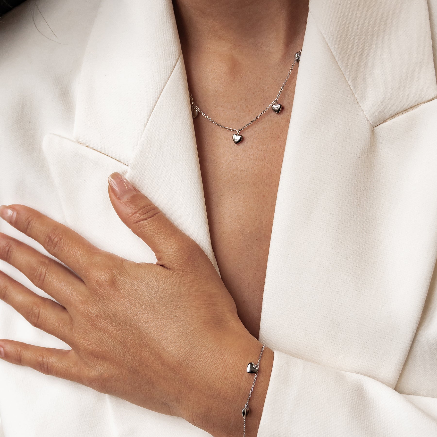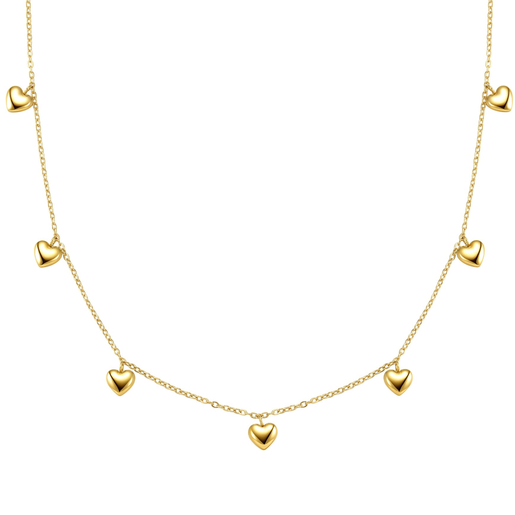 This necklace is an eye-catching piece, featuring several chunky heart pendants delicately arranged along the chain. Made from high-quality stainless steel, it comes in gold, rose gold, and silver finishes, offering a luxurious look that complements any style. Waterproof for practicality, this necklace adds a playful yet refined element to your outfit, making it a must-have for those who love bold yet timeless jewelry.