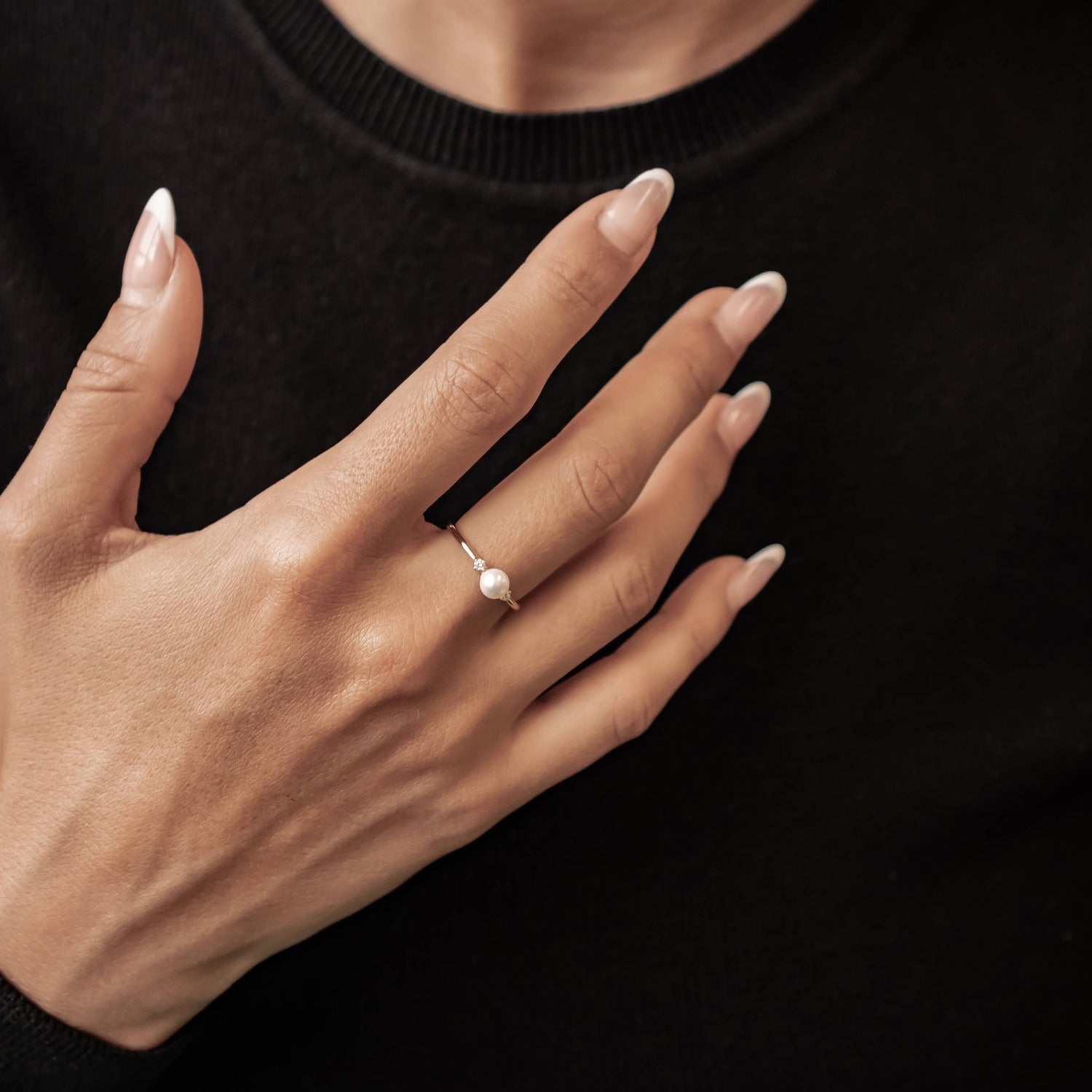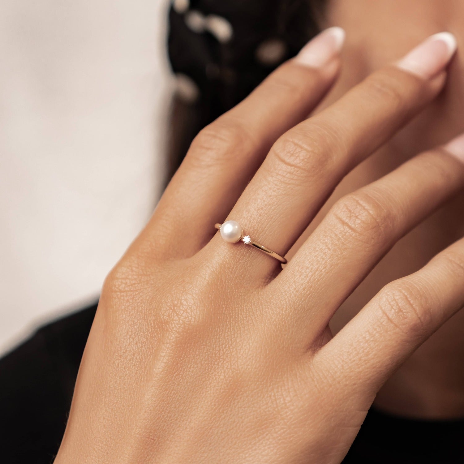 The New Beginnings Pearl Ring symbolizes renewal and fresh starts. Crafted in solid 14K gold, it features a luminous pearl accented by two delicate diamonds, reflecting balance and gentle support. A timeless piece designed to mark meaningful moments and new chapters.