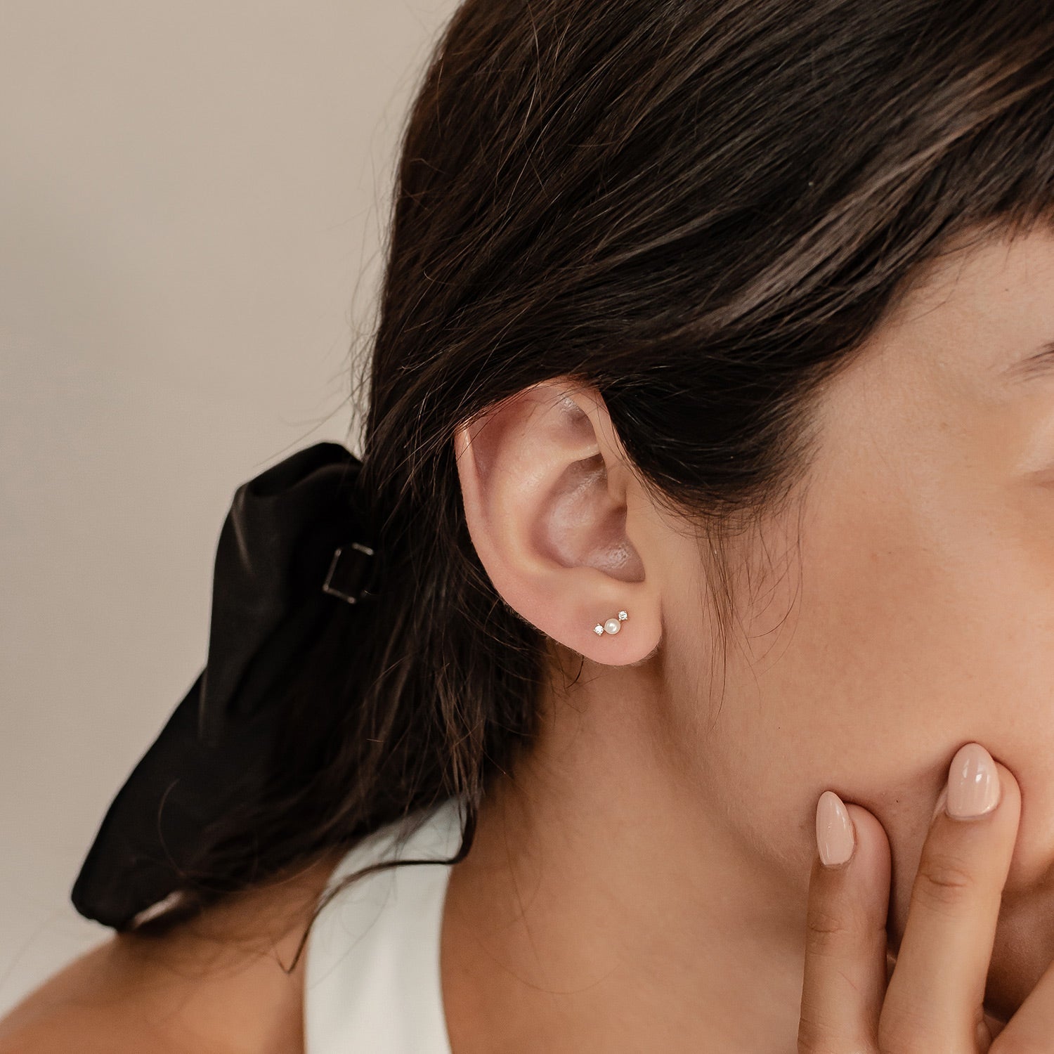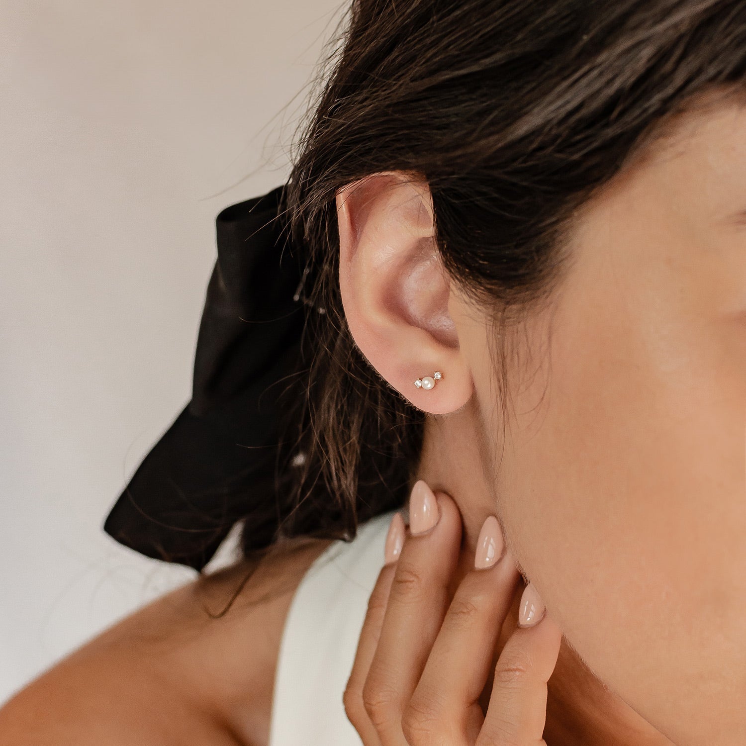 Well-known symbols of wisdom, serenity, and longevity, pearls make a subtle but powerful statement. Featuring a pristine pearl flanked by two small zirconia stones and 14 karat 585 solid gold hardware, our New Beginnings Stud Earrings are designed to bring a sense of calm and confidence to the wearer. The perfect accessory to guide you into a fresh start. Also, check out United Stud Earrings 9K Gold.