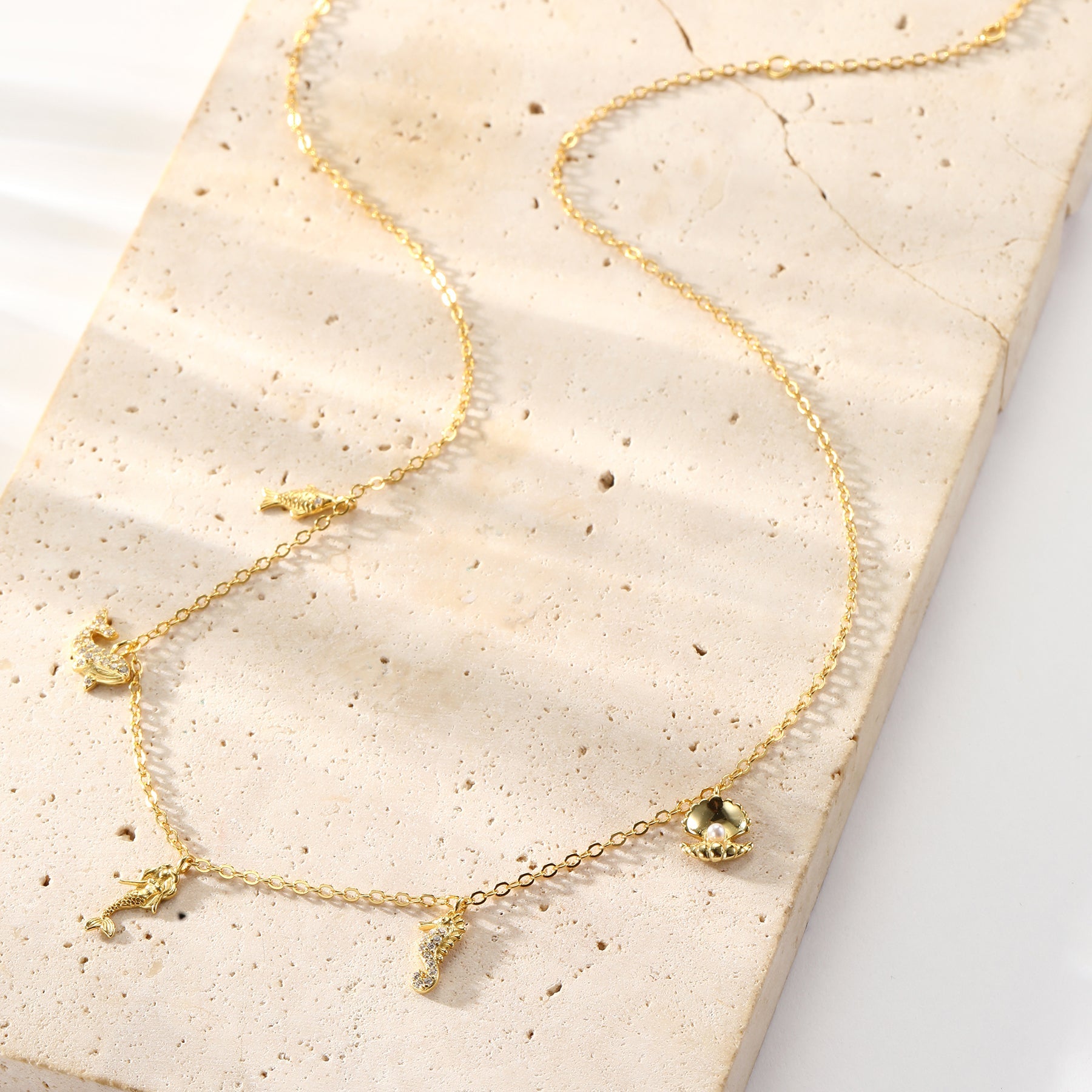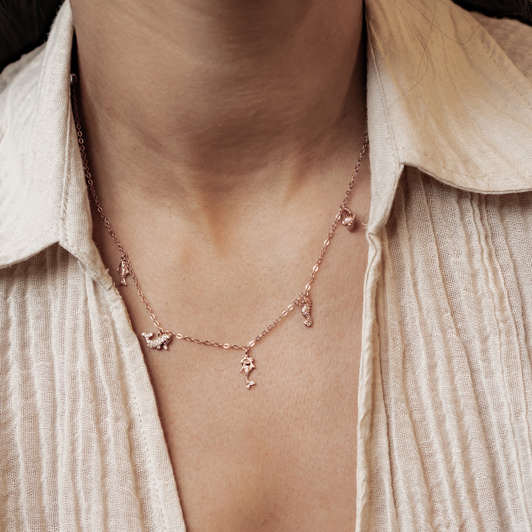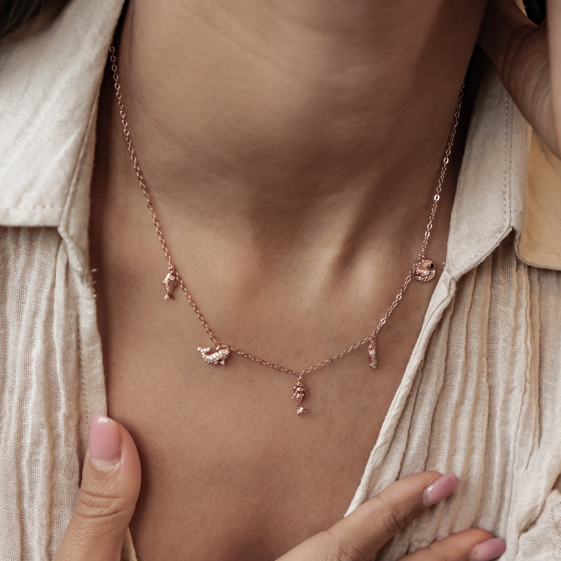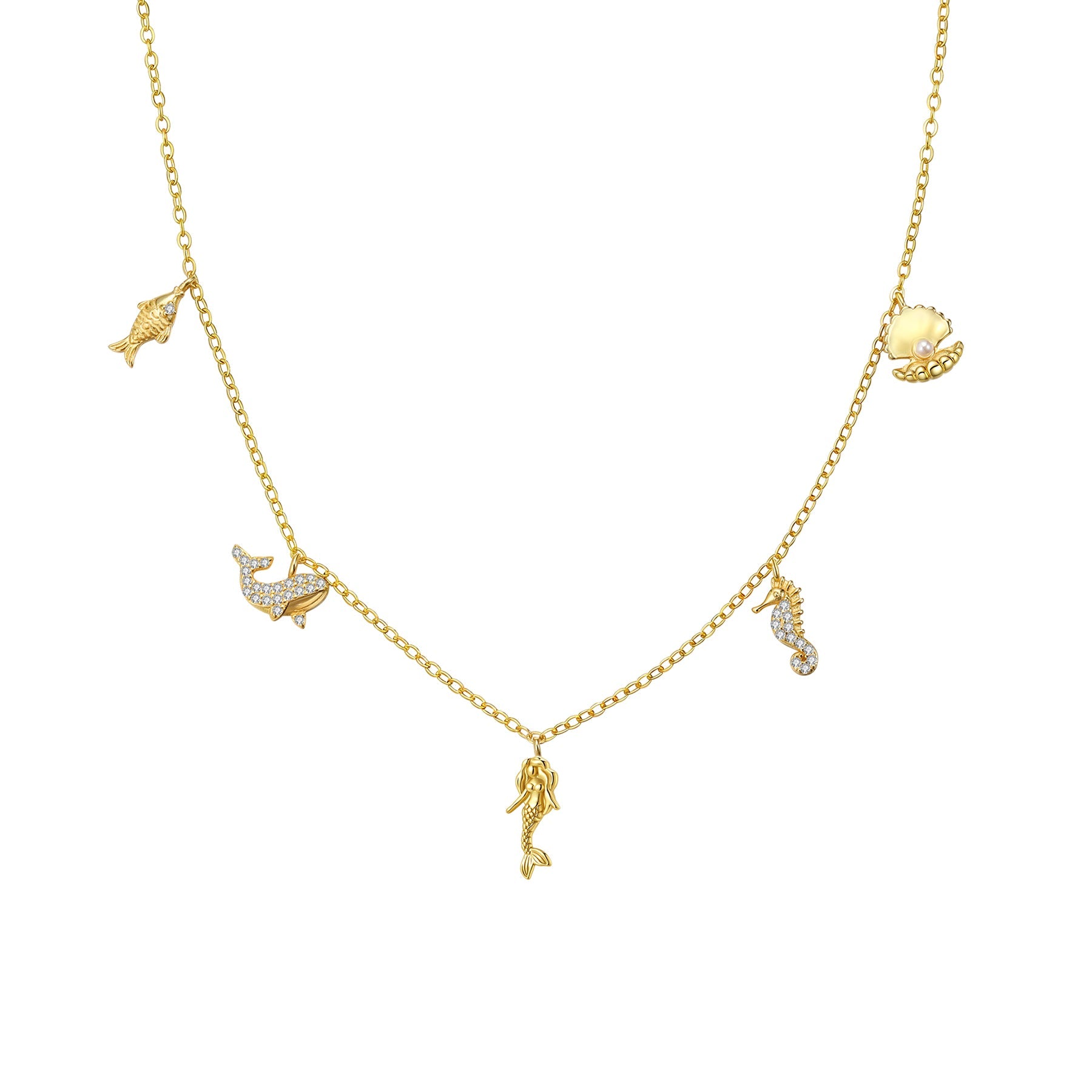 Inspired by the beauty of the sea, this necklace features five delicate charms — a mermaid, dolphin, fish, seahorse, and seashell. Each charm adds its own personality, creating a fun, summery piece full of movement and sparkle. Made of sterling silver and available in gold, rose gold, and silver, it’s a perfect choice for anyone who loves ocean-themed jewelry and effortless everyday styling.