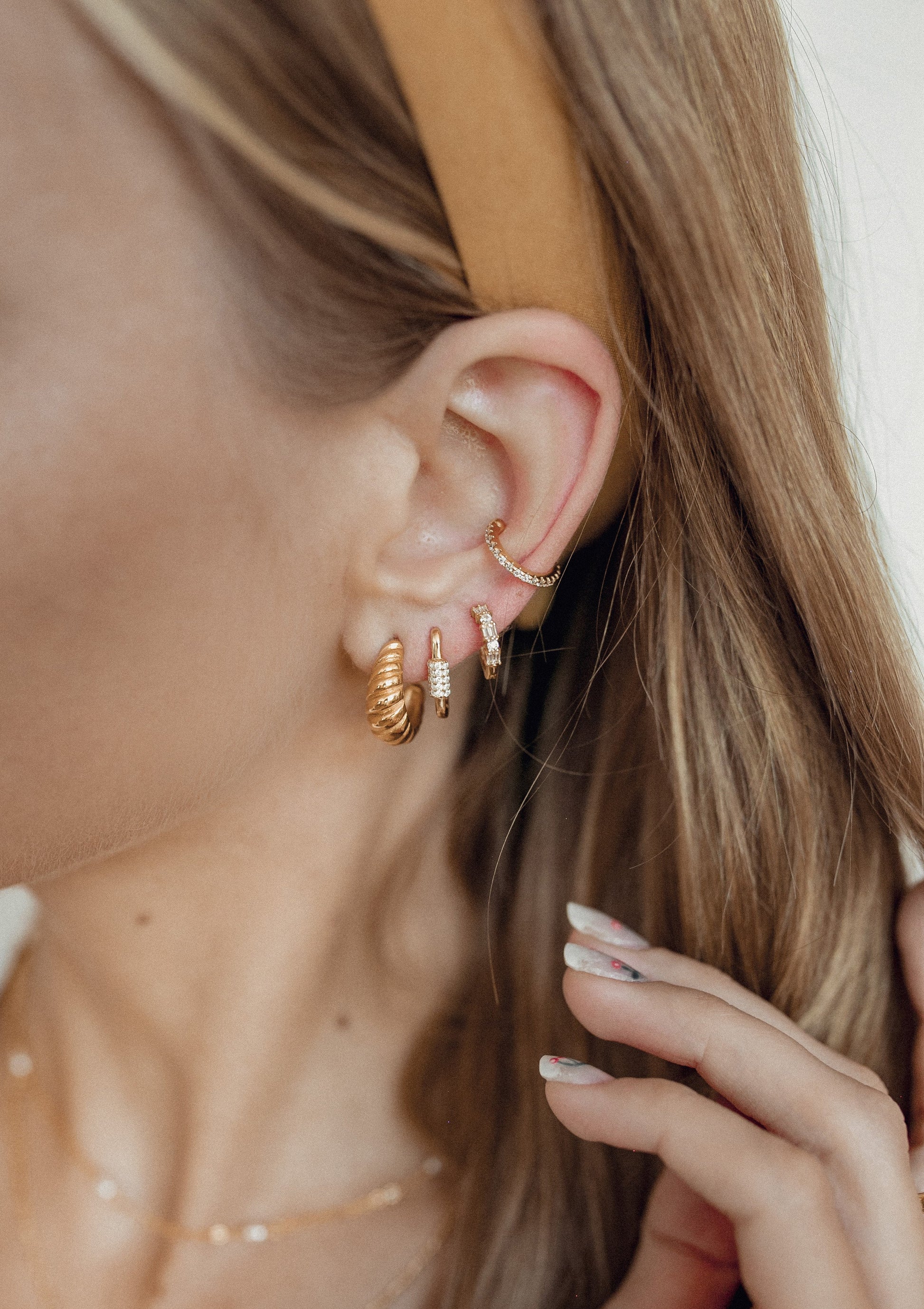 These oval-shaped huggie earrings are made from 18 karat gold-plated sterling silver and feature a zirconia-encrusted carabiner design in the middle of their front edge. They also have rounded edges, a thin ear piece and a hinged opening on their lower edge, ensuring a comfortable fit. Streamlined, elegant and timeless, this is a pair of earrings that will elevate any outfit. Also check out Oval Hoop Huggie Earrings Sterling Silver Gold.