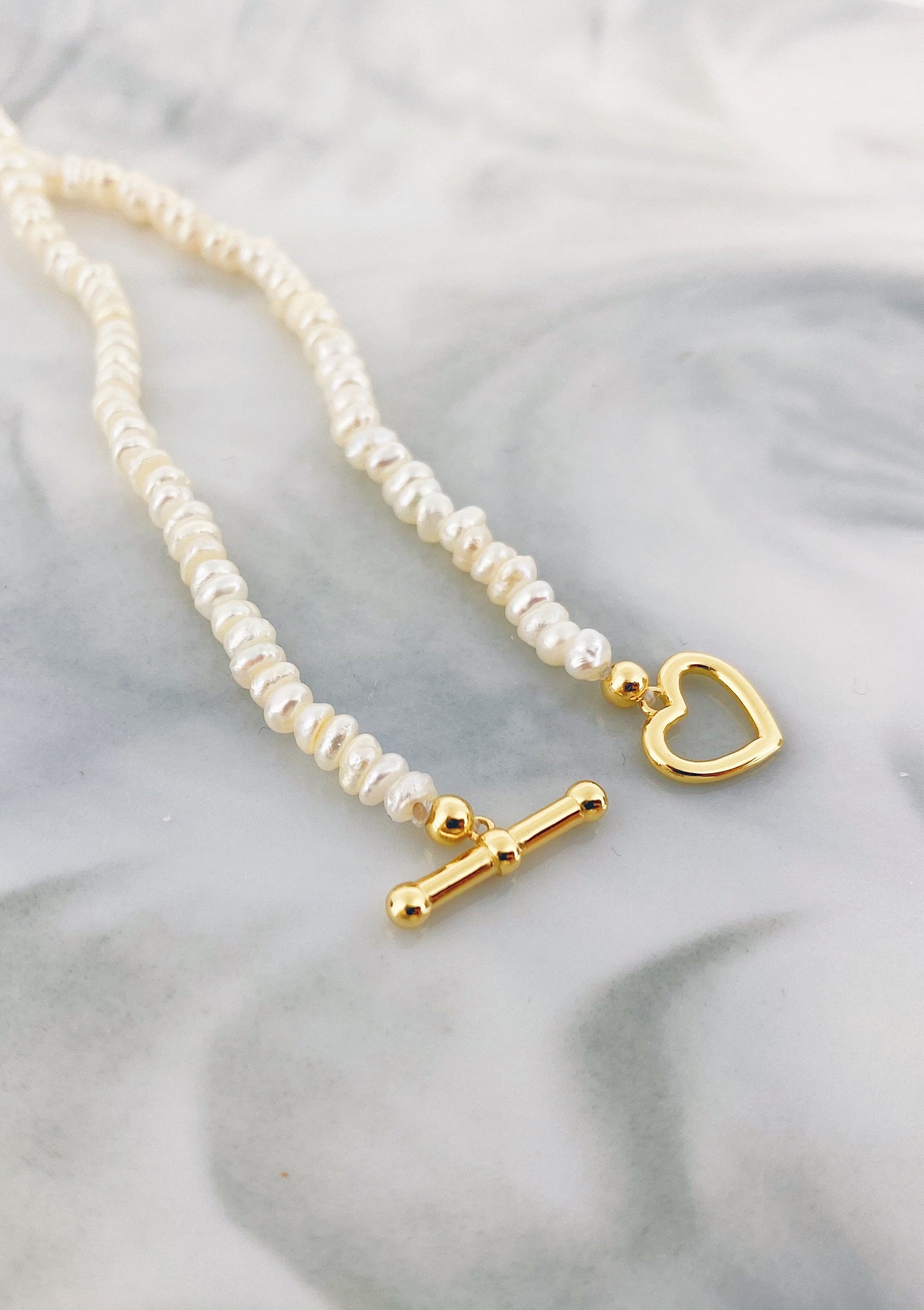 This necklace is made up of multiple tiny natural fresh water pearls and is fastened together with an 18 karat gold-plated sterling silver heart-shaped T-bar clasp (where a rod passes through the middle of a heart-shaped pendant). This is a unique, feminine and polished piece, one that will work well with plain tees, ruffle blouses, or even a statement sleeve - you choose! Also check out Shell Rectangle Pendant T-Bar Chain Necklace Gold.