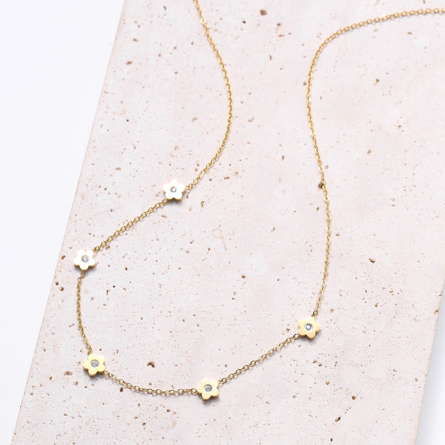 This is an 18 karat gold-plated stainless steel necklace consisting of five petite flower-shaped charms, each with a small zirconia in the center, attached to the front edge of a thin chain and a ‘lobster claw’ spring clasp at the back. A short extension chain with hanging seashell pendant allows the overall fit to be adjusted. A classic necklace that is able to be purchased separately or together with matching stud earrings. Also check out Smiley Face Pendant Necklace Gold.
