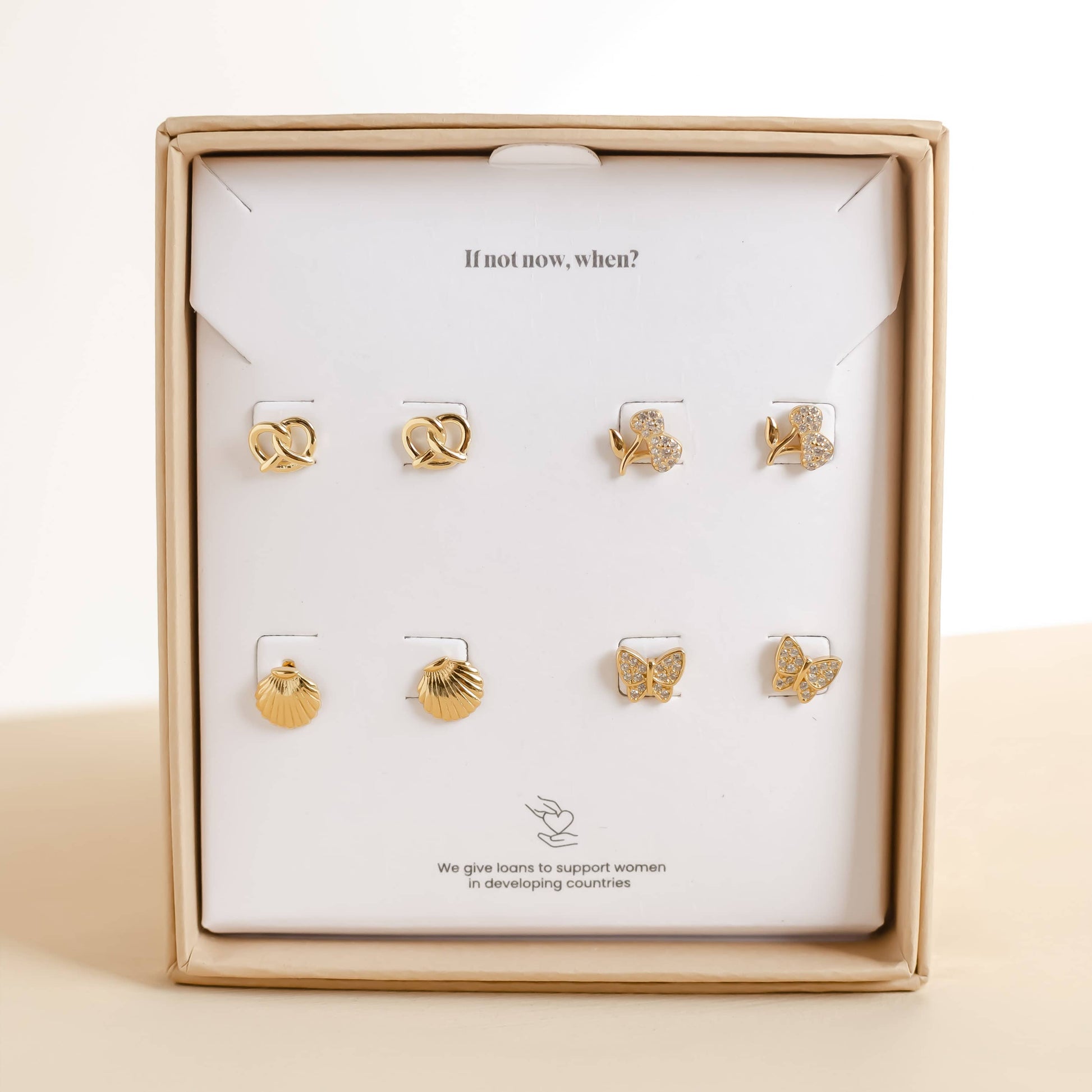 The Playful Earring Set is the perfect addition to your jewelry collection. This set includes 4 pairs of stud earrings featuring fun and unique designs such as a butterfly, cherrie, scallop shell, and pretzel. Available in gold, rose gold, and silver, these earrings are a playful and stylish way to elevate your outfit.