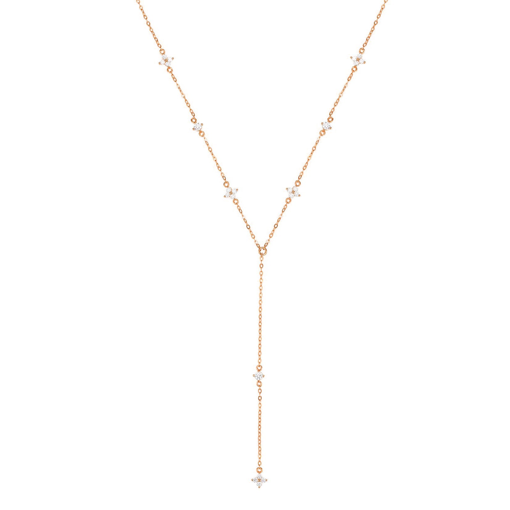 A Y chain necklace made from 18 karat gold-plated sterling silver with eight different clusters of zirconia stones (five flower-shaped charms with four zirconia stones in each, and three single, four-prong-shaped zirconia), the tail end of the Y is threaded through a round jump ring that sits center front. It fastens with a lobster clasp and short extension chain with three jump rings, allowing you to find your perfect fit. A dainty design that will sweeten up a spring dress or sleek monochrome pantsuit. Also, check out Floret Charm Necklace Sterling Silver Gold.