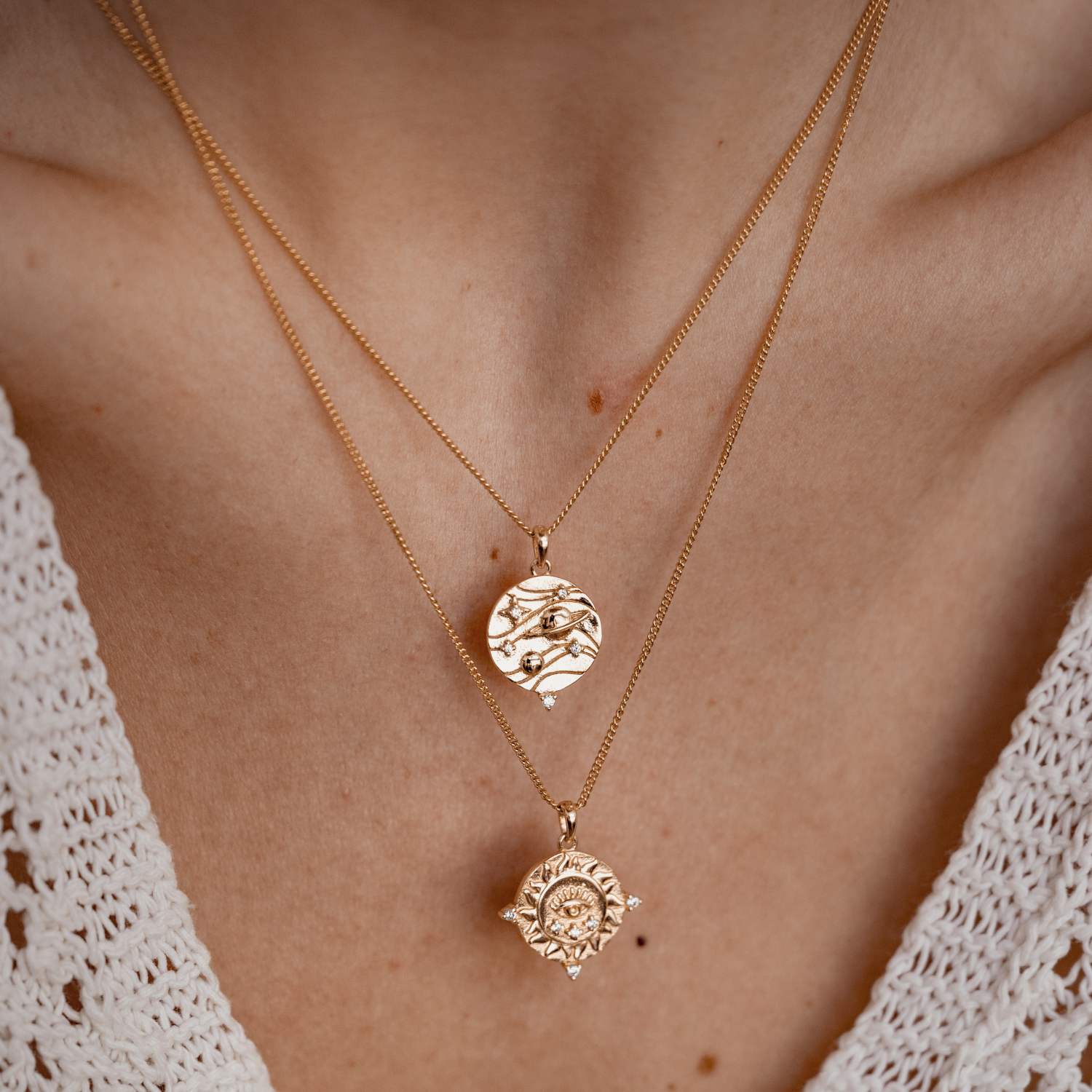 Discover our Protection Pendant Necklace, available in 18K gold-plated sterling silver and sterling silver. The chain necklace features a removable pendant with an eye in a blazing sun, adorned with zirconia stones. Fasten it with a round spring clasp and choose your length with four adjustable jump rings. In sterling silver, the pendant is engraved with the word 'Protection,' enhancing your sense of safety. This sophisticated piece serves as a personal keepsake, providing both style and sanctuary. Also, check out Protection Studs 9K Gold.