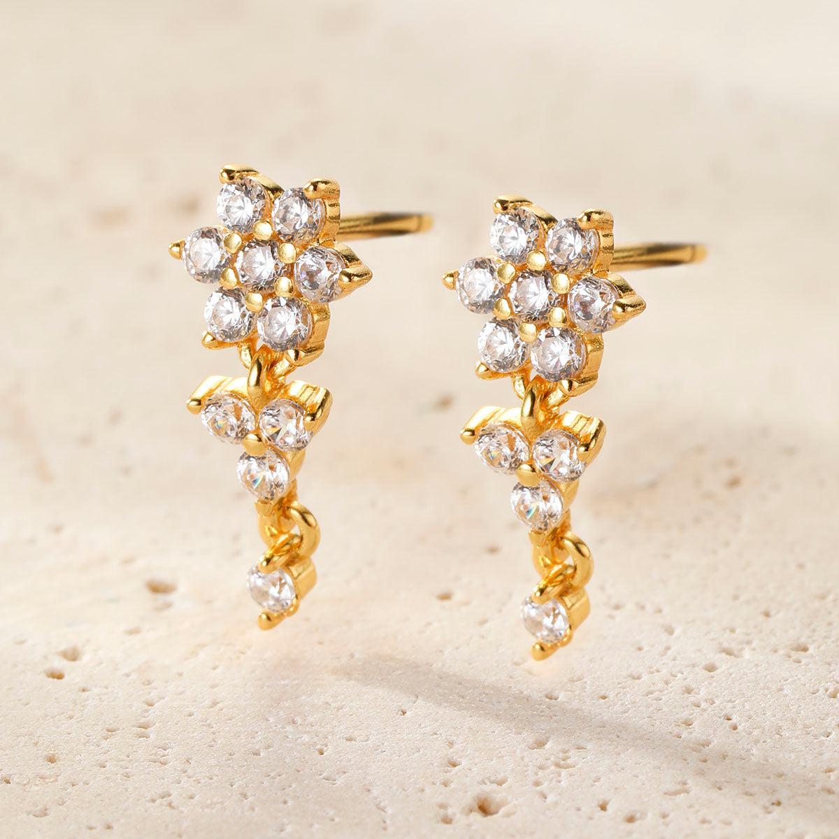 Add a touch of elegance and movement to your look with our Radiant Bloom Drop Earrings. Crafted from high-quality sterling silver and available in three stunning finishes, this design features a sparkling floral cluster of cubic zirconia at the top, paired with a delicate chain of shimmering stones that gracefully extends along the earlobe. Lightweight yet eye-catching, these earrings are perfect for both solo styling and layered ear stacks. Whether you're dressing up for a night out or adding a bit of flair to your everyday look, this pair will bring a radiant floral charm to any outfit.